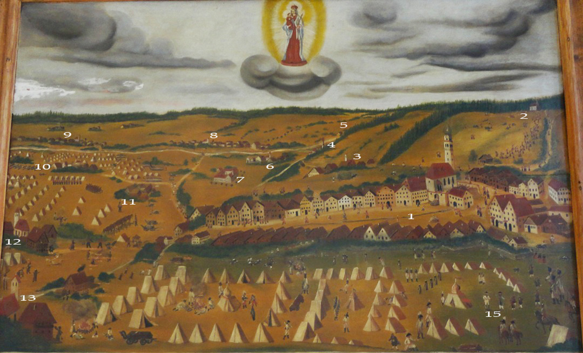 Bildlegende: 1. Markt Aidenbach, 2. Kapelle Buchenöd, 3. Karling mit Kapelle, 4. Kloster Aldersbach, 5. Schönerting, 6. Aldersbach mit Pfarrkirche St. Peter, 7. Aldersbach Klostermaierhof Schwaig, 8. Walchsing mit Kirche, 9. Kriestorf mit Kirche, 10. Weng mit Kapelle, 11. Gumperting, 12. Gunzing, 13. Heft mit Kapelle, 14. Fouragierplatz, 15. Unterhandlungen der Aidenbacher Bürger mit den österreichischen Besatzern. Bild: © Nikolaus Arndt / Wolfgang Vierling.