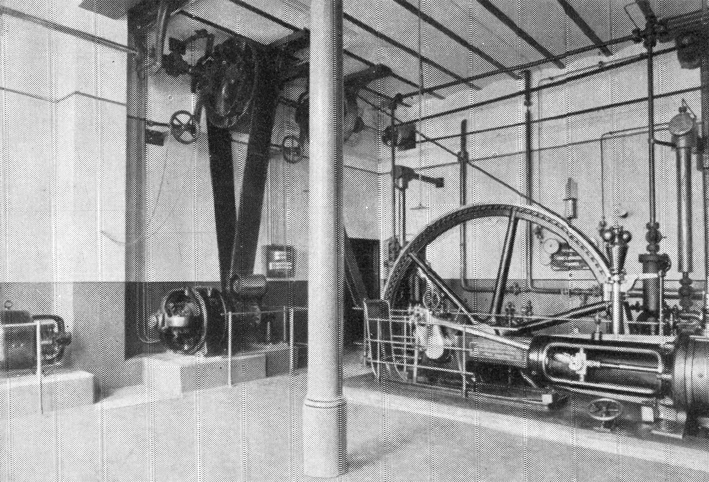 Die eigene Stromerzeugungsanlage (Gleichstrom) weist, da das Werk auch einen Überlandanschluss mit 20000 Volt Drehstrom besitzt, einen Umformer (S. 24) von Drehstrom auf Gleichstrom auf. Dazu gehört der 100 PS Drehstrom-Motor. Die Hochspannungsanlage wurde geliefert von der Ostbayerischen Stromversorgungs-AG in München, Überlandwerk Eggenfelden. Außerdem ist hier zu ebener Erde noch der Ammoniak-Verdampfer für Salzwasser-Kühlung, der Süßwasserkühler für Würze- und Gärkellerkühlung in einem eigenen Apparatenraum untergebracht. Im dritten Stockwerk kommen wir zur Wasserenthärtungsanlage für Kesselspeisewasser, Dampfvorwärmer, für Warmwasserzwecke und zum Ammoniak-Berieselungskondensator und zum Hochspannungsanschluss mit Transformator. Die Leistung der Kälteanlage wurde 1929 durch Aufstellung neuer Apparate verdoppelt.