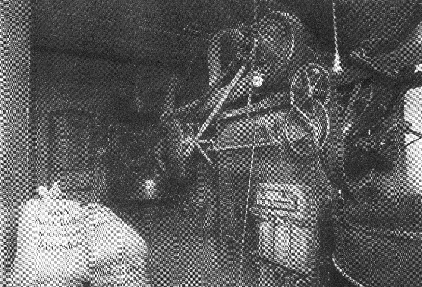(S. 25) Im ersten Stockwerk des Mälzereigebäudes befindet sich auch noch die 1923 von Van Gülpen Emmerich am Rhein eingerichtete Malzkaffee-Rösterei. Sie enthält zwei Schnell-Großröster. Ihr Produkt wird in ganz Südbayern verkauft lose und in Säcken, aber auch in Pfundpaketen mit gefälliger Ausstattung. Der Aldersbacher Malzkaffee wird von allen Hausfrauen, die ihn einmal kennengelernt haben, wegen seiner gleichbleibenden Qualität und seiner Preiswürdigkeit geschätzt. Im zweiten Stockwerk stoßen wir auf den Hopfen-Gebrauchslagerraum, in dem bemerkenswerter Weise nur heimisches Erzeugnis zu finden ist. Die vorhandene Schrotmühle ist eine moderne Seckmühle (Firma Seck in Dresden). Wieder einige Schritte weiter finden wir die Brauwasser-Enthärtungsanlage, Kalksättiger mit Klärreserve. Das Kühlschiff von F.J. Sommer Landshut verrät noch seine einjährige „Jugend". F.J. Sommer hat auch den Schwaden-Kondensator zur Ausnutzung des Pfannendunnstes vom Sudhaus für Warmwasserzwecke eingerichtet. Der Malzkeim-Silo hat einen Fassungsraum für eine Ladung. Ferner bemerken wir noch die Gersteputzerei, ebenfalls von Sommer Landshut und ein weiteres Malzsilo mit 1500 Zentnern Fassungsvermögen. Der bis zum Letzten durchgeführten „Mechanisierung" entspricht der Aufzug im Pendelsystem, der das Grünmalz von zu unterst bis hinauf unters Dach befördert, und der bei jeder Maschine zu beobachtende motorische Einzelantrieb, der Transmissionen überflüssig macht. Das dritte Stockwerk beherbergt die Gerstenempfangsanlage, die Malzputzerei, Malzpoliermaschine und drei Gerstenböden, die eine Lagerungsmöglichkeit für 10000 Zentner bieten.