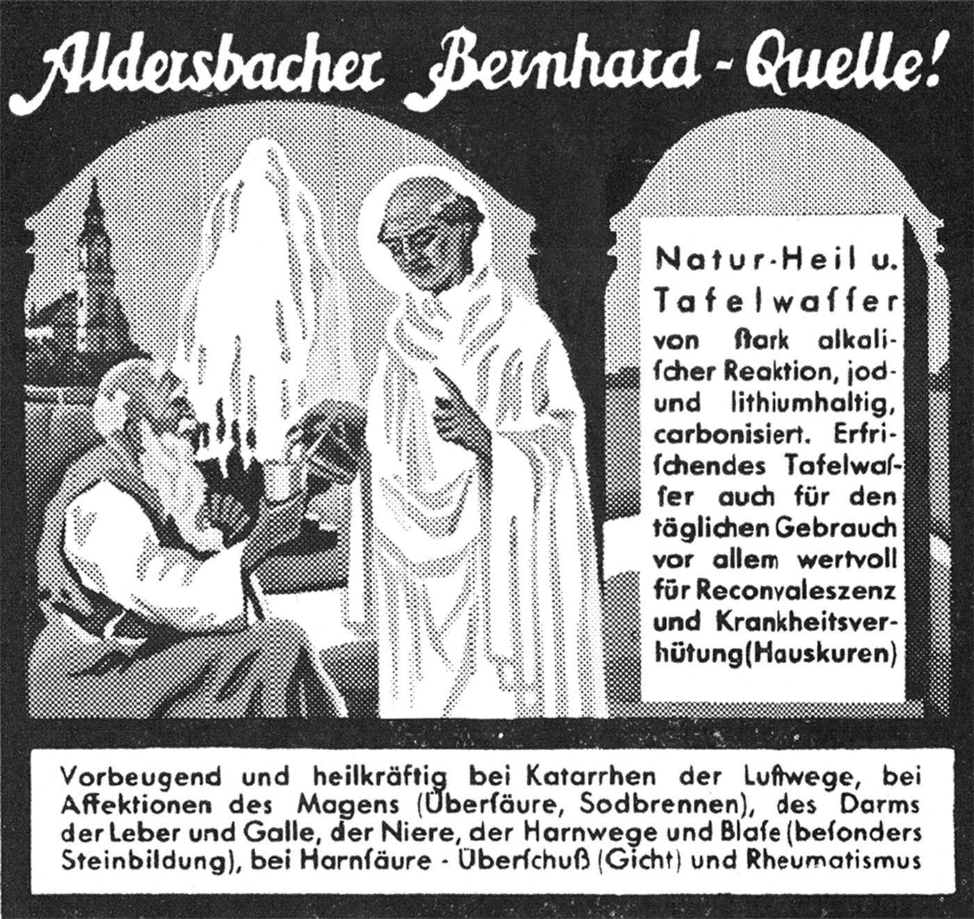 Und nun haben wir zum Schluss noch eine kleine Überraschung. Wir befinden uns zwar auf dem Boden einer Brauerei, aber trotzdem beziehungsweise gerade deshalb spielt hier eine große Rolle – das Wasser. Und welcher Braumeister und Brauereileiter hätte noch nicht davon geträumt, über Nacht ein Wasser erbohrt zu haben, das an Weichheit alles bisher Dagewesene, auch das in Pilsen mit nur zwei deutschen Härtegraden, übertrifft: So hat man denn auch in Aldersbach vor drei Jahren gebohrt. Einen Tiefbrunnen bis auf 56 Meter hinab! Und siehe da, nach unendlichen Mühen – mit einem 10 Zentner schweren Meißel musste gearbeitet werden – sprang der Quell. Zwar nicht, wie sich herausstellen sollte, zum Bierbrauen geeignet, aber ein Quell merkwürdiger Zusammensetzung, die vom Charakter aller Brunnen der Umgegend weit abweicht. (S. 31) Er enthält eine große Menge an Natronsalzen. Das Wasser steht nach den eingehenden Untersuchungen des Universitätsprofessors Dr. R. Dietzel, Mitglieds der Deutschen Forschungsgesellschaft für Lebensmittelchemie in München, den alkalischen Tafelwässern nahe und ist noch durch einen schwachen Gehalt an Lithium- und Jodverbindungen ausgezeichnet. Seine Radioaktivität wurde mit 10.1 Mache-Einheiten festgestellt. Allen alkalischen Quellen gemeinsam ist ihre schleimlösende, antikatarrhalische Wirkung, ihr wohltätiger Einfluss auf entzündete Schleimhäute. Dieser reizmildernde Effekt ist eine der Hauptursachen der günstigen Wirkungen, welche die alkalische Quelle bei Katarrhen der Luftwege, des Magen=Darmkanals, der Gallen- und der Harnwege entfalten. Aus der Wirkung der Alkalien auf die Magensaft-Sekretion (Herabsetzung der Übersäure) erklärt sich die große Bedeutung der alkalischen Wässer bei der Bekämpfung des chronischen Magenkatarrhs und der häufig damit verbundenen Übersäure. Die Nierentätigkeit wird durch die alkalischen Wässer im Sinne einer Durchspülung und Auswaschung des Körpers beeinflusst. Unzweifelhaft ist auch ihre harnsäurelösende Eigenschaft. Die alkalischen Wässer sind deshalb wirksame Heilfaktoren für die Behandlung der harnsauren Veranlagung und der harnsauren Steinbildung. Die alkalischen Quellen werden demnach angewandt gegen chronische Katarrhe jeder Art, insbesondere des Magens und Darmkanals, der Gallen- und der Harnwege, bei Steinbildung in den Gallenwegen und in den Nieren, bei überschüssiger Harnsäurebildung, gegen Gicht und Rheumatismus. Dieser neue Quell in Aldersbach liefert also ein hochwertiges Natur-, Heil- und Tafelwasser, das sich in medizinischen Kreisen zunehmender Beachtung erfreut. Der bereits aufgenommene Versand hat sicherlich (S. 32) eine Zukunft. Die Quelle wurde „Aldersbacher Bernhard-Quelle" genannt, nach dem „Stifter" des Zisterzienser-Ordens.