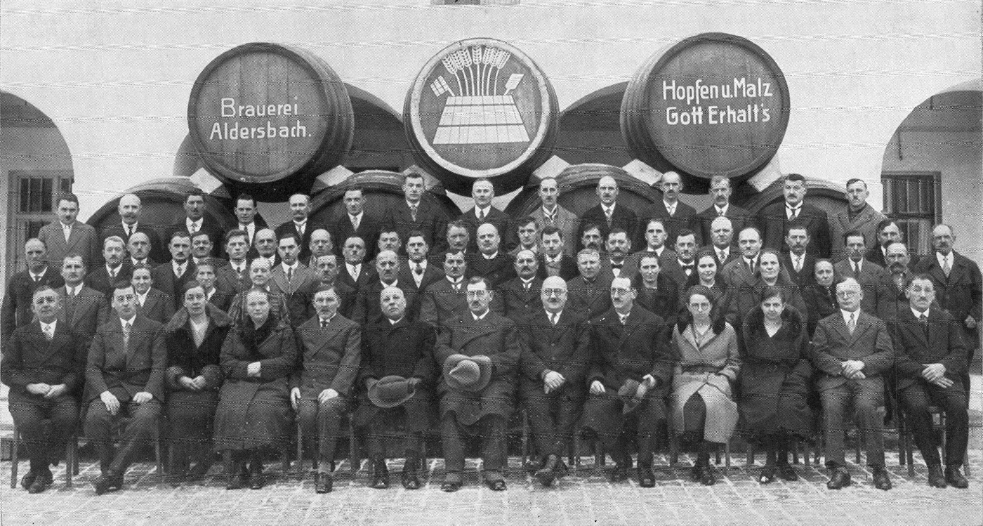 Auch derjenigen unter dem 70 Köpfe zählenden Personal sei gedacht, die durch langjährige Dienstzeit den Aufstieg miterlebt haben und als Jubilare der Arbeit mit der Verdienstmedaille des Bayerischen Industriellen-Verbandes ausgezeichnet wurden. Es sind dies die Herren: 1. Hausl Max, Braumeister, Dienstzeit 35 Jahre. 2. Burkhardt Hans, Hauptkassier, Dienstzeit 28 Jahre. 3. Feldl Johann, Obermälzer, Dienstzeit 38 Jahre. 4. Huber Joseph, Bierführer, Dienstzeit 34 Jahre. 5. Feldl Karl, Brauer, Dienstzeit 33 Jahre. 6. Moser Franz, Brauer, Dienstzeit 30 Jahre. 7. Straubinger Franz, Maurer, Dienstzeit 28 Jahre. 8. Brunnwieser Ignaz, Zimmerer, Dienstzeit 27 Jahre. 9. Kneidinger Karl, Maurer, Dienstzeit 27 Jahre. 10. Eder Franz, Brauer, Dienstzeit 26 Jahre. 11. Nagl Max, Gärführer, Dienstzeit 26 Jahre. 12. Baumgartner Franz, Mälzer, Dienstzeit 25 Jahre. 13. Perzl Joseph, Mälzer, Dienstzeit 25 Jahre und 14. Baur Joseph, Oberbinder, Dienstzeit 25 Jahre.