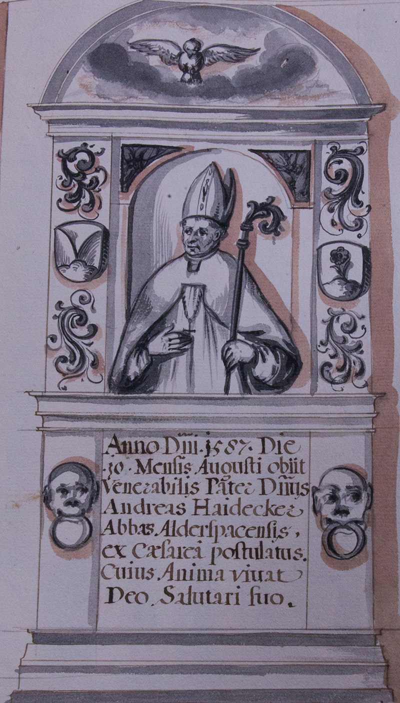 Im jahr .1585. den .10.ten Augusti ist von diser Weld abgeschiden der Hochwürdtige Vatter Herr Andreas Haydeckher der .36. Abbt dises Closters, beruefft von Kaysershaim, alwo er Burscharius oder Großkheller etlich jahr geweßen: Sein seel woll leben Gott seinem Hayl. Hat der Abbtey angetretten im jahr .1577. unnd also .10. jahr Regirt.