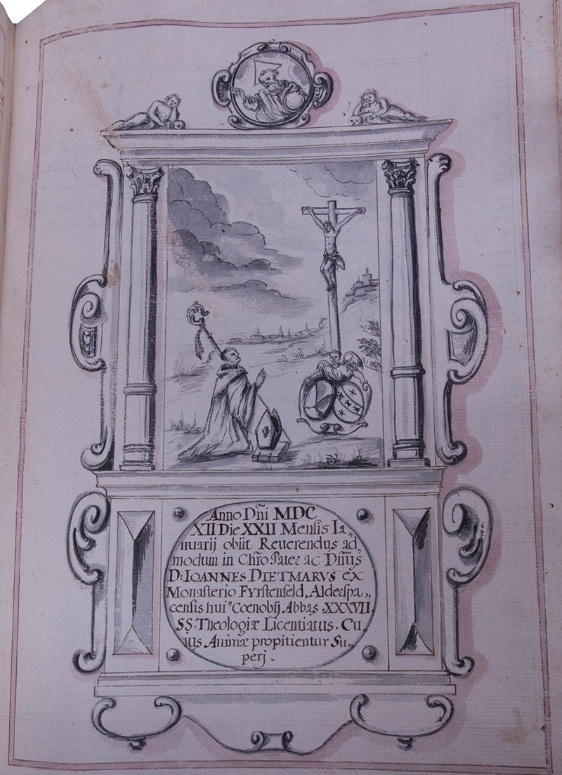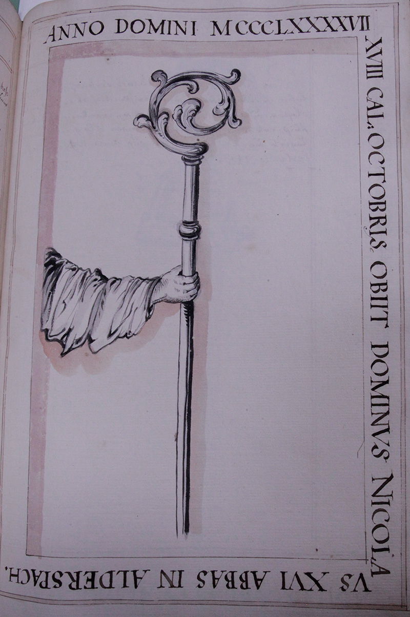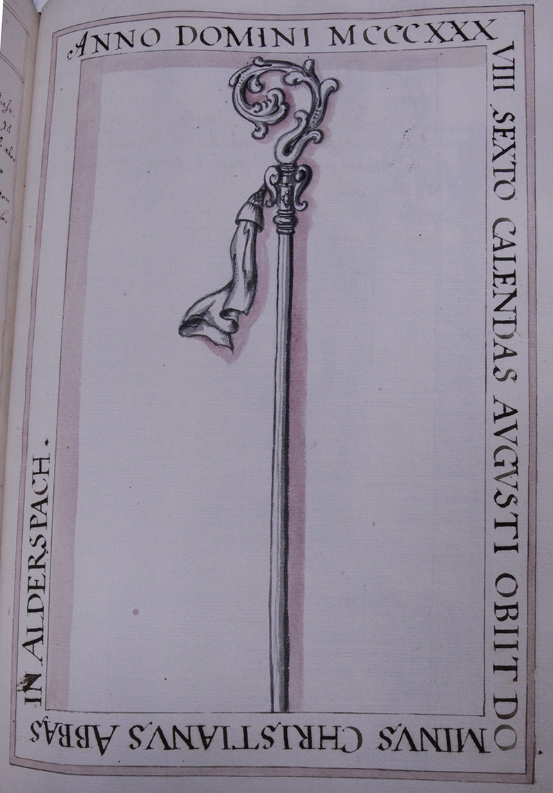 Im Jahr .1612. den .24. Januarii ist verschiden der Hochwürdige in Gott Vatter unnd Herr Herr Johannes Dietmayr auß dem Closter Fürstenfeld, dises Closters Alderspach Abbt der .37. der Heiligen schrifft Licentiat dessen Seel seye Gott Genedig, hat die Abbtey angetretten anno .1588. ist loblichist mit grossem nuz und wolfart des Closters biß in die .25. jahr vorgestandten.