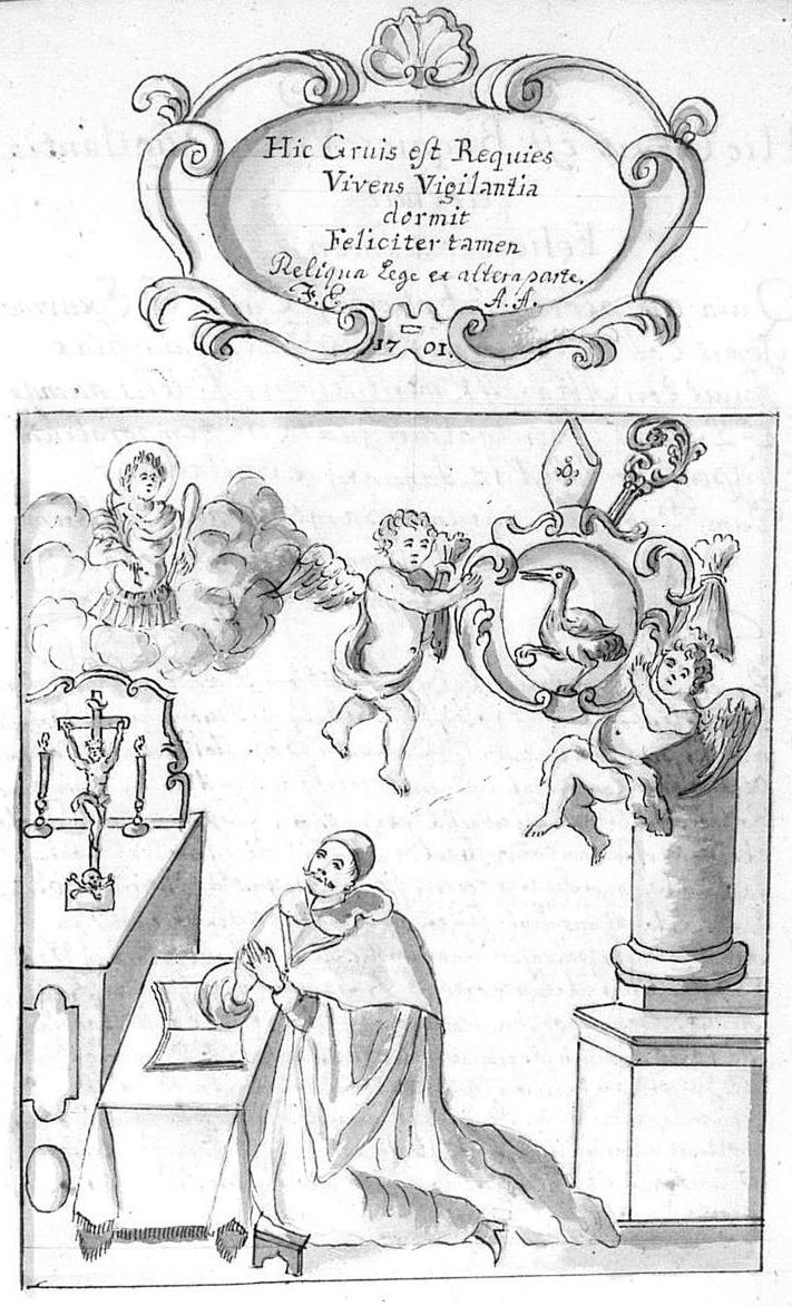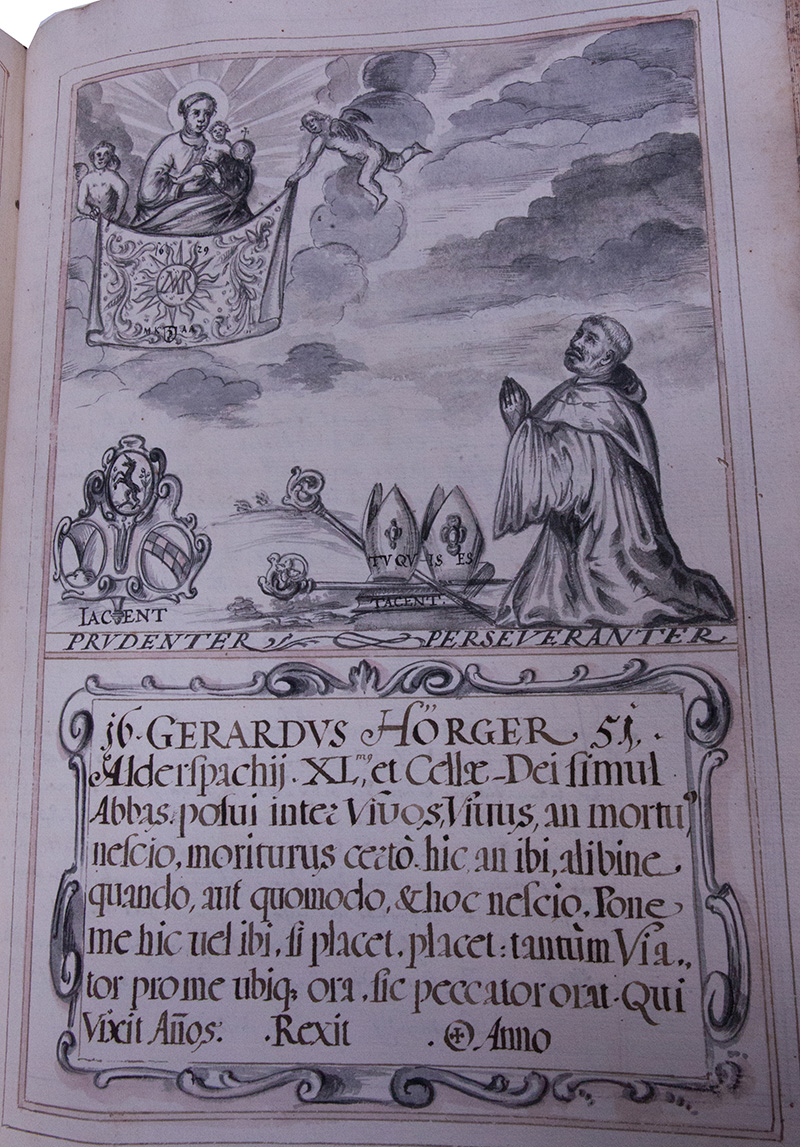 Herr Abbt Gerhardt der .40.iste dises Closters unnd .7. jahr auch zugleich zu Gottszell, hat ihme disen marmelstain selbsten noch im Leben außhauen unnd aufrichten lassen. welcher erstlich Anno .1651. den .8. Jenner auß einem Prior, uber .7. jahr beichtvatter zu Seeligenthall, unnßers ordens vor der statt Landtshuett der Closter Jungfrauen, welchen er zu schwärlichen Kriegszeiten unnd fluchten nuzlichist vorgestanndten: Zu einem Abbt zu Gottszell erwöhlt, confirmirt, unnd infuliert worden alß aber nach .4. wochen alß den .1.sten Februar Herr Abbt Matthaeus alhie Todts verblichen, ist er anno Eodem alß anno 1651. an Dominica Laetare, den .19. Martii auch Abbt zu Alderspach alhie einhelliglich erwöhlt: damit aber dem wolvorbenantem Closter Gottszell in unkhosten wegen so kurzer Zeit widerumb einer neuen Election verschont wurdte, hat des Heyligen Ordens General Herr Herr Claudius Vaussin mit demselben auf .7. jahr dispensirt, baide Abbteyen beysamen zubehalten, daß Closter hat er Gottszell hat er von Grund wider aufgericht, so zu friedtszeitten anno .1648. ist abgebrent worden. Nach .5. jahren hat er solche freywillig abgetretten und allain zu Alderspach verbliben. Gott verlengere ihme sein glickhliche Regirung zu nuz und wolfahrt, sowol seines alß aller Clöster in ob ein nidern Payrn, denen er alß Vicarius Generalis: und Furstenveld, Gotts: und Fürstenzell Pater Immediatus Loblich bißhero vorgestandten. Dise Grabschrifft aber lauttet auf Teutsch also Im jahr .1651. Gerardus Hörger zu Alderspach der vierzigiste und zugleich Abbt des Closters Gottszell, hat diß gesezt undter den lebendtigen, lebendig oder Todt das waiß ich nit, gewiß wirdt ich sterben; hie, dort, oder anderstwo, wan, oder wie? auch diß waiß ich nit. Lege mich hie oder dorthin wann es dir also gefalt, gefalts mir, allein du wanderer bette für mich an allen orthen, also bittet dich ein sinder, welcher gelebt hatt jahr hat Regiert ist verschiden im jahr auf den .2. Infuln: wer bistu? auf den .2. biechern: sye schweigen, auf den wappen sye ligen verstendig bestendig.
