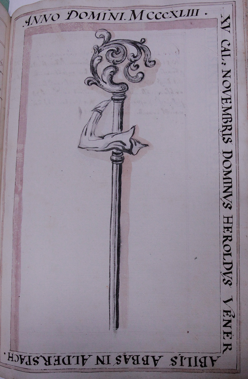 Herr Heroldus .XVI. ist an Sanct Laurentii Tag im jahr .1341, unndter der Praesidirung Herrn Albrecht Abbten zu Ebrach, zu Abbteylichen wurden erhebt worden, solche aber nit Lenger alß .3. jahr erhalten: nach welchem, alß er erkhranckht, unnd die gesundheit widerumb zu erlanngen sich nacher Passau begeben, ist er aldorten des Lebens gar beraubt worden im Jahr .1344.