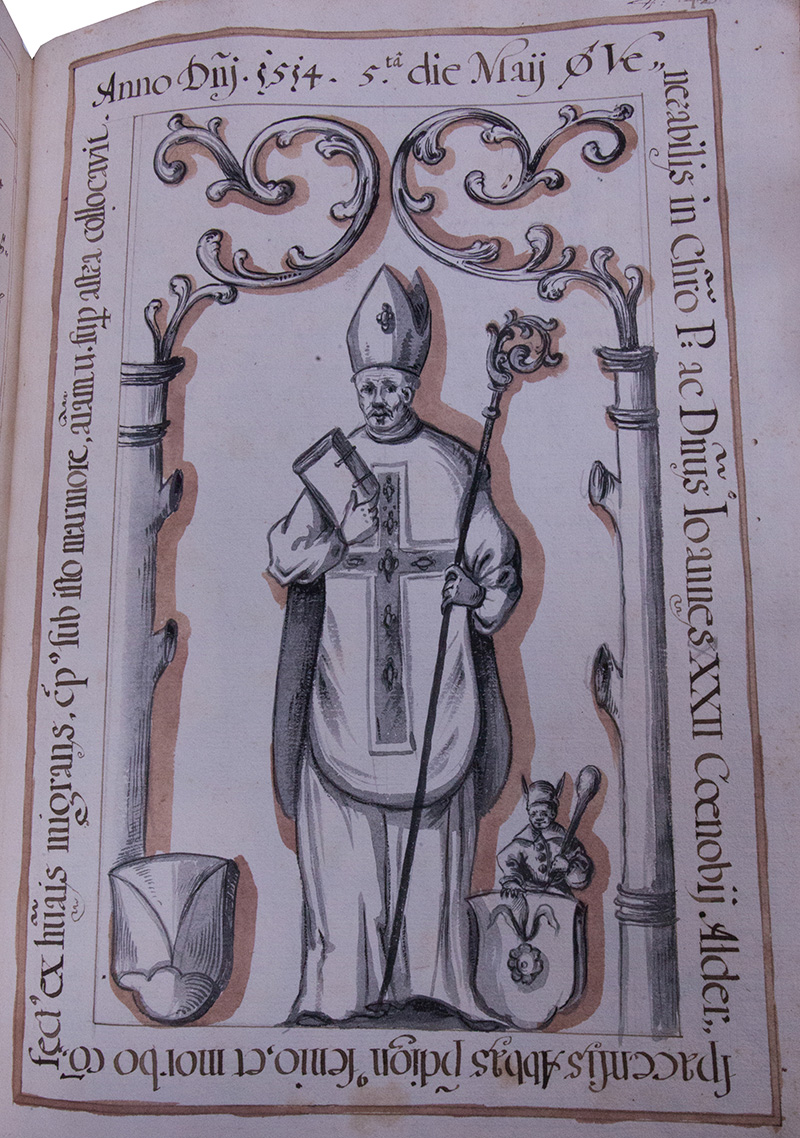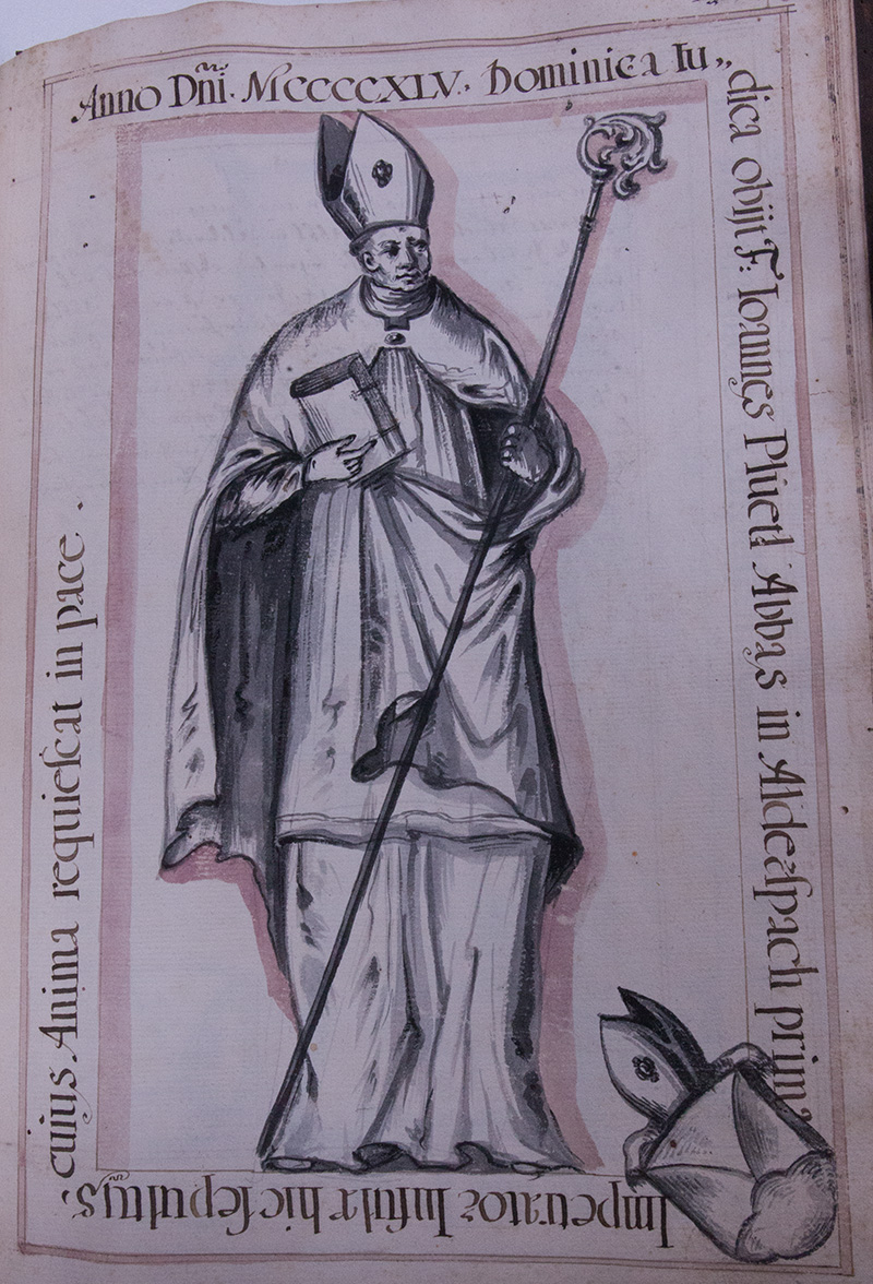 Im jahr .1448. Martii den .10. am Sontag nach Judica ist Herr Joannes Plüetl der .27. Abbt in Alderspach verschiden, so erstens die Inful erlangt, alhie begraben dessen Seel ruhe im Friden. Anno .1442. den .14. Jenner ist er zur Abbtey erwöhlt worden, gebürtig von Hofkürchen, in der Election praesidirte Herr Hainrich Abbt zu Ebrach. Zuvor war er zu Krembs auf unßern güettern. Anno 1444. war er zu Basel auf dem Concilio, und erlangte dem Closter die Inful: deren unkhosten ein Burger zu Passau Völckhl mit namen, von ihme gerichtlich angekhlagt und uberwundten hat herschiessen müessen.