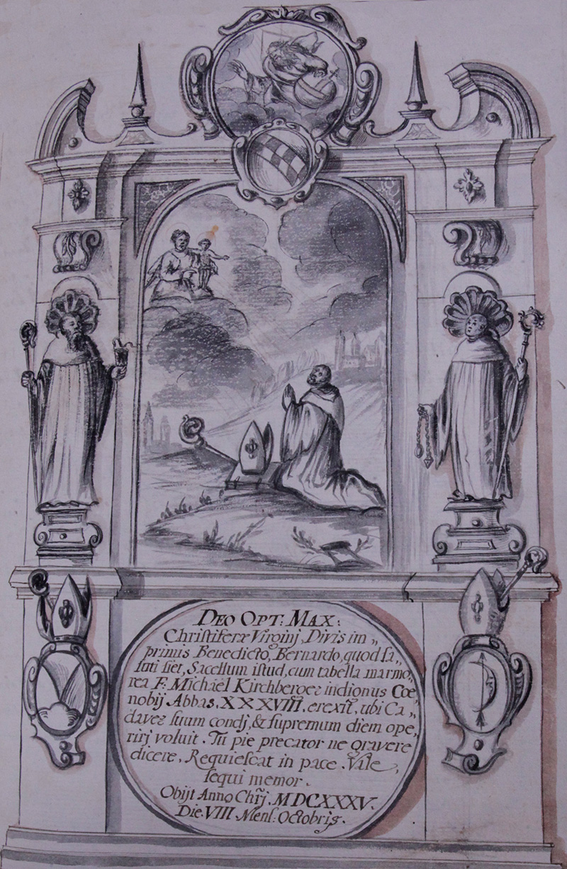 Gott dem Allerhöchsten unnd Besten, der Jungfraue: unnd Christi gebererin, den heiligen, insonderheit Benedicto, Bernardo, auf daß zu Ehren stehe dise Capelln mit dem Märbelstainen Altärl, hat Frater Michael Kirchberger unwürdtiger Abbt dises Closters der .38.ist aufgericht, wohin er seinen Todten Leichnam hat wollen vergraben lassen, aldort, den jungsten Tag zuerwarten, du Andechtiger fürbitter, beschwere dich nit zu sagen. Ruhe im friden. Lebe wol; gedenckh, das du folgen werdest.