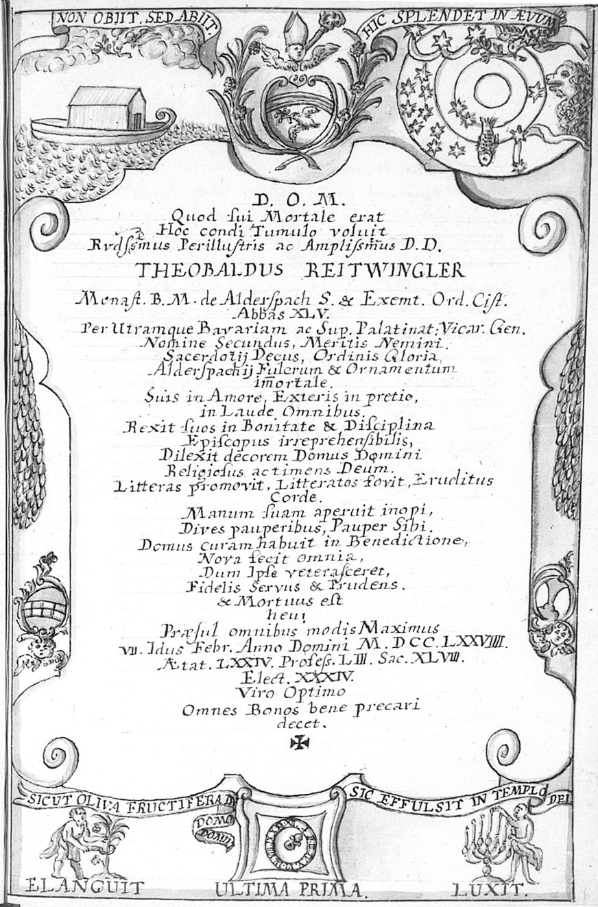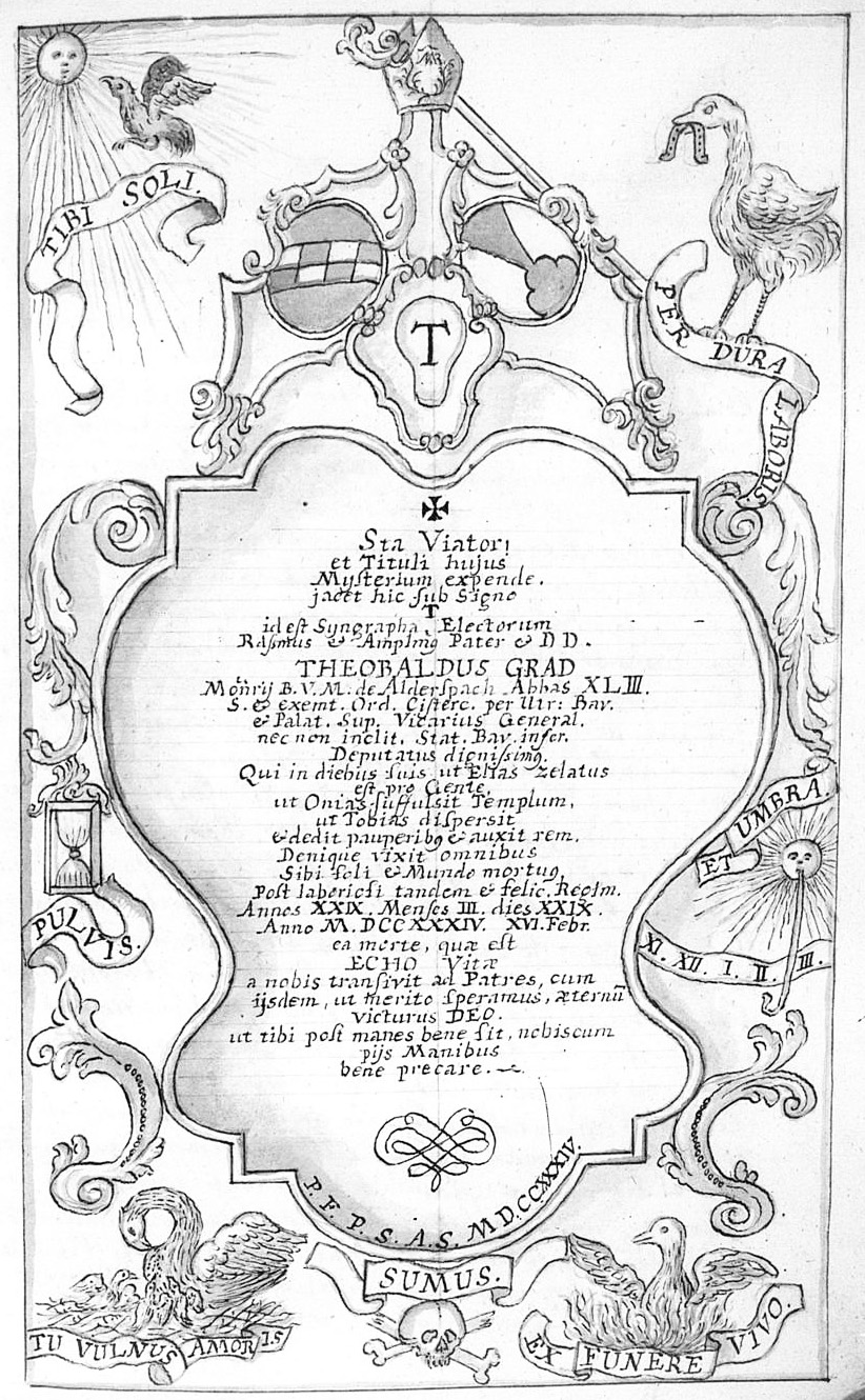 [Übersetzung ChatGPT: Theobaldus, der erste Abt mit diesem Namen und 43. Abt insgesamt, wurde unter dem Namen Grad während der Zeit gewählt, als der Römische Kaiser Joseph I. Bayern mit seinen Streitkräften besetzt hatte, nämlich im Jahr 1705. Unter dem Schutz des hochwürdigen Herrn Abt Stephan von Salem und der Assistenz des hochwürdigen Herrn Abt Abbund von Fürstenzell wurde der vorherige Prior am 21. Oktober einstimmig zum Abt dieses Klosters gewählt. Nach der Weihe durch den Abt von Salem gemäß den Privilegien des Ordens und den bayerischen Konkordaten wurde der neu gewählte Abt nach der Verkündigung des Kaisers den kaiserlichen Kommissaren vorgestellt. Der hochwürdige von Constannte, Dekan der Münchner Kollegiatkirche und kaiserliche Kommissar für die Zeit empfand dies jedoch als widersprüchlich und verbot dem neu gewählten Abt daraufhin die Verwaltung der weltlichen Angelegenheiten. Darüber hinaus erhielt der neu gewählte Abt aufgrund der Kriegswirren im [Kloster] Stams in Tirol ohne Zustimmung des Münchener Kirchenrats den Segen und bot so Anlass für neue Kontroversen. Der Streit um das Recht der Verwaltung der weltlichen Angelegenheiten dauerte bis 1707, wobei Rom zustimmte und der Kaiser ablehnte. Schließlich trat Wilhelm, der Abt von Ebrach, als unmittelbarer Vater auf, um größere Schäden für das Kloster abzuwenden, und erreichte nach demütigen Bitten beim Grafen von Lewenstein, dem damaligen Verwalter unseres Klosters, dass der Gewählte in der Verwaltung der weltlichen Angelegenheiten eingesetzt wurde. Dieser Abt regierte später sehr glücklich und richtete mit den Einkünften, die er als Provinzdelegierter über viele Jahre gesammelt hatte, unsere Kirche von Grund auf neu her und schmückte sie mit neuen Malereien Asams. Er erweiterte das heilige Inventar, baute die Abtei und Unterkünfte für Gäste von Grund auf neu, und überall wurde er als Vater der Armen gehört. Als Marienverehrer sorgte er dafür, dass die Filialkirche in Frauentödtling in eine moderne Form gebracht wurde. Ein Mann voll des Geistes Elias, aber dennoch der Demütigste von allen, gab am 21. Februar 1734 um 17 Uhr abends seinen Geist dem Schöpfer zurück.]