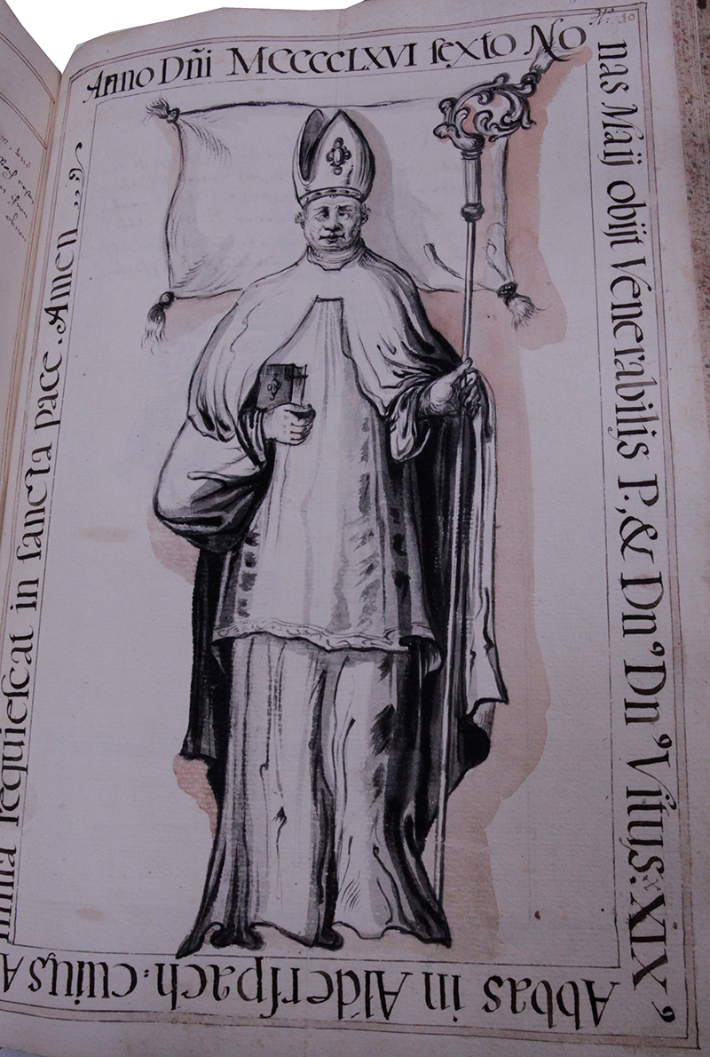 Herr Vitus der .29. Abbt diß Closters ist erwöhlt worden den .10. Octobris Anno 1463. hat Regirt .2. jahr .6. monath, ist gestorben den .4. Mai Anno .1466. begraben in dem Capitl, ist in seines vorfahrers Election Abbt zu werden vermaint worden, das ubrige ist in nachvolgenten beschreibungen der Abbten weittleiffiger beschriben.