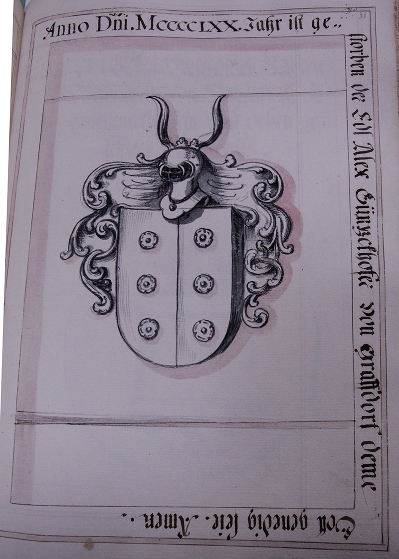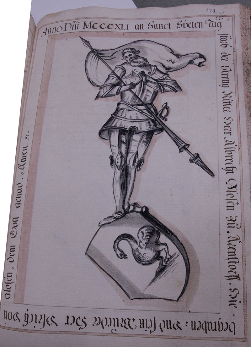 Im Jahr .1376. ist verschiden der Edle mann unnd streittbare Soldat Hainrich Tuschl von Seldenau. welcher unnser Closter freygebig begabt hat.
