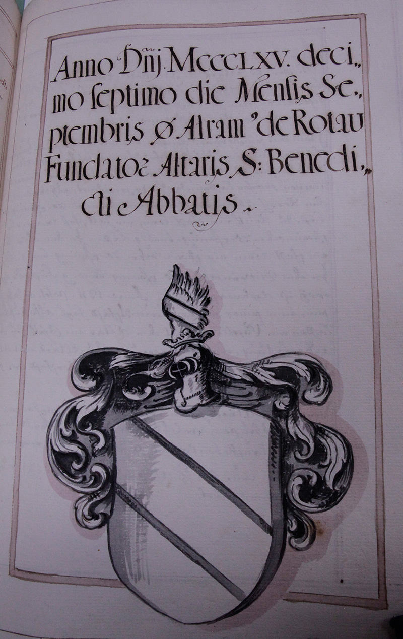 Alram von Rottau ist verschiden den .17. Septembris anno .1345. Stüffter deß Altars Sancti Benedicti Abbtens, hat auch hiehero verschafft die Vogtey zu Töttling uber die widen in seinem testament, Item In Clessing zwo hueb, lent unnd guett zu einem rechten Seelgrath Anno .1287. Item mit seinem Brueder Reickher, und mit willen seiner Hausfrau Christein, und seines Brueders Sohn Alrams hat er einen Altar in dem Capitl zu Alderspach in Sancti Benedicti unnd Bernardi namm machen lassen, darzue er gewidmet, auff der m? in dem Rerech .26. mezen Korns, ein schwein, oder .20. pfening, 9. Käß. zu Reuth ein schaf Korn, ein halb schaf waiz, ein schwein, oder 25. pfening, und .9. Käß. In dem Obernhaag ein Schaf Korn, ein schwein oder .20. pfening unnd .9. Käß. In dem Mitternhaag .30. pfening und .9. Käß: die Mässerey ist aitenbachisch. Anno .1311. stehet; er habe für sein nur seiner ganzen freundtschafft Hayl alhie auffbauen lassen, ein Capellen sambt dem Altar im Capitl, zu derer aufferbauung, und zu ersezung deß Altars mit allen zuegehörungen hab er volgendte güetter verschafft wie oben: alß noch ains so jährlich zahlt .3. solidi denarii.