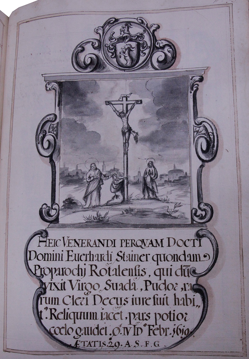 Alhie, deß Ehrwürdtigen, wolgelehrten Herrn Eberhardts Stainers zur Zeit Pfarrers in Rottalmünster (.welcher als er gelebt Jungfreylich, beredt, schamhafftig, war er billich erhalten, für ein seltene Zierd der Christey.) ligt das ubrigt: der vornembere Thail geniest deß himmels ist verschiden dem .10. Februarii im jahr .1619. seines Alters im .29. jahr.