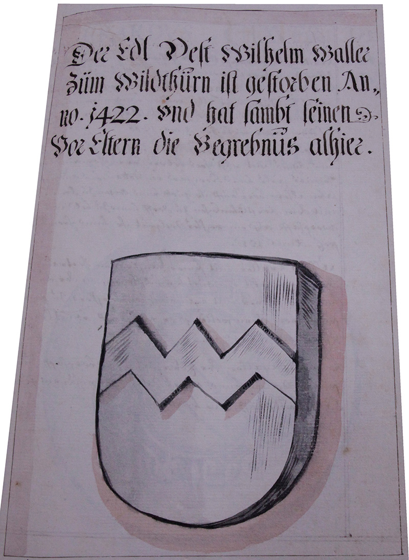 Albero Waller mit seiner Hausfrauen gertrautt, hat frey hieher geschenckht ein guet bey Vilzhoven in der Au genant, unnd ein anders mit namen Schweikhersperg zu seiner unnd seiner voreltern seelig, so er erkhaufft von Alram von Rottau. Anno 1263.