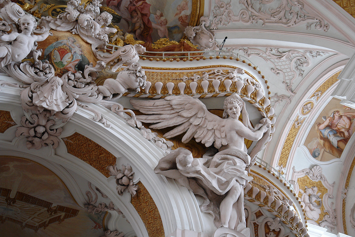 Mit größtem dekorativen Geschick ist die Orgelempore behandelt. Sie schweift in barockster Bewegung gegen die Mittelachse der Kirche vor. Zwei Binnenpfeiler tragen sie. Über diesen stützen Atlantenengel die Brüstung, die in der Mittelachse mit einer reichen Kartusche besetzt ist; letztere umschließt ein Gemälde der thronenden Himmelskönigin mit dem Klosterwappen. Weiterhin schmücken die Brüstung Rosettenfelder, die Zwischenflächen sind mit gelbem Brokat bemalt. Unterhalb der Orgelempore zieht sich eine schmale Empore an der Westwand der Kirche hin. Die geschweifte Vorkragung, auf der sie ruht, ist mit Bandwerk von etwas jüngerem Datum stuckiert. In der Mitte fällt ein kunstvolles Gehäuse auf, das ehemals dem Abt zur Adoration diente.