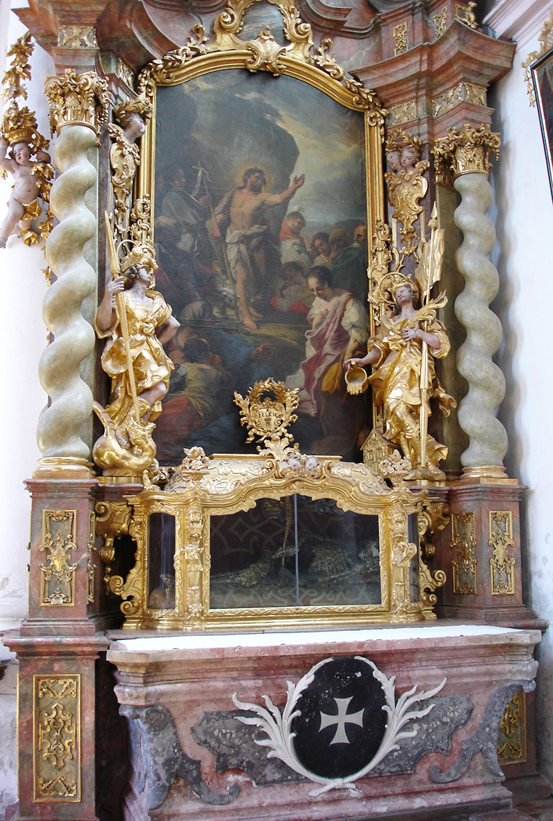 Kreuz- und Marienaltar: Innerhalb der marmornen Kommunionbank mit kunstvollen schmiedeeisernen Gittern erhebt sich rechts der Kreuzaltar oder Sakramentsaltar; das Ewige Licht deutet an, dass hier das Allerheiligste im Tabernakel steht. Auf der linken Seite der Marienaltar. Die Altarblätter zeigen die Jahreszahlen 1728 und 1729. Nach dem Stil zu schließen, stammen auch diese Altäre von Götz. Die Figuren gehören eher der Werkstatt von Wenzel Jorhan aus Griesbach an. Je vier gewundene Säulen, zwischen denen Seitenfiguren stehen, flankieren die Altarbilder. Die Bekrönung zeigt je ein Oberbild, das von großen und kleinen Engeln umgeben ist. Zwei große Engel halten über dem Scheitel in graziöser Bewegung eine Krone. Die Altarblätter stellen Maria Heimsuchung links und rechts die Kreuzabnahme nach Rubens dar. Beide wurden der Signatur zufolge von Johann Georg Bergmiller gemalt: "Bergmiller fecit Ao. 1728 bzw. 1729". Diese Altäre haben vorzüglich komponierte Drehtabernakel, darüber je eine Büste von Maria bzw. von Joseph. Letztere sind sicher Werke von Jorhan. Seitenfiguren am rechten Altar: Die Märtyrerdiakone Stephanus und Laurentius – Oberbild: der Gute Hirt. Seitenfiguren am Marienaltar: Joachim und Anna – Oberbild: Maria als Ordenspatronin.