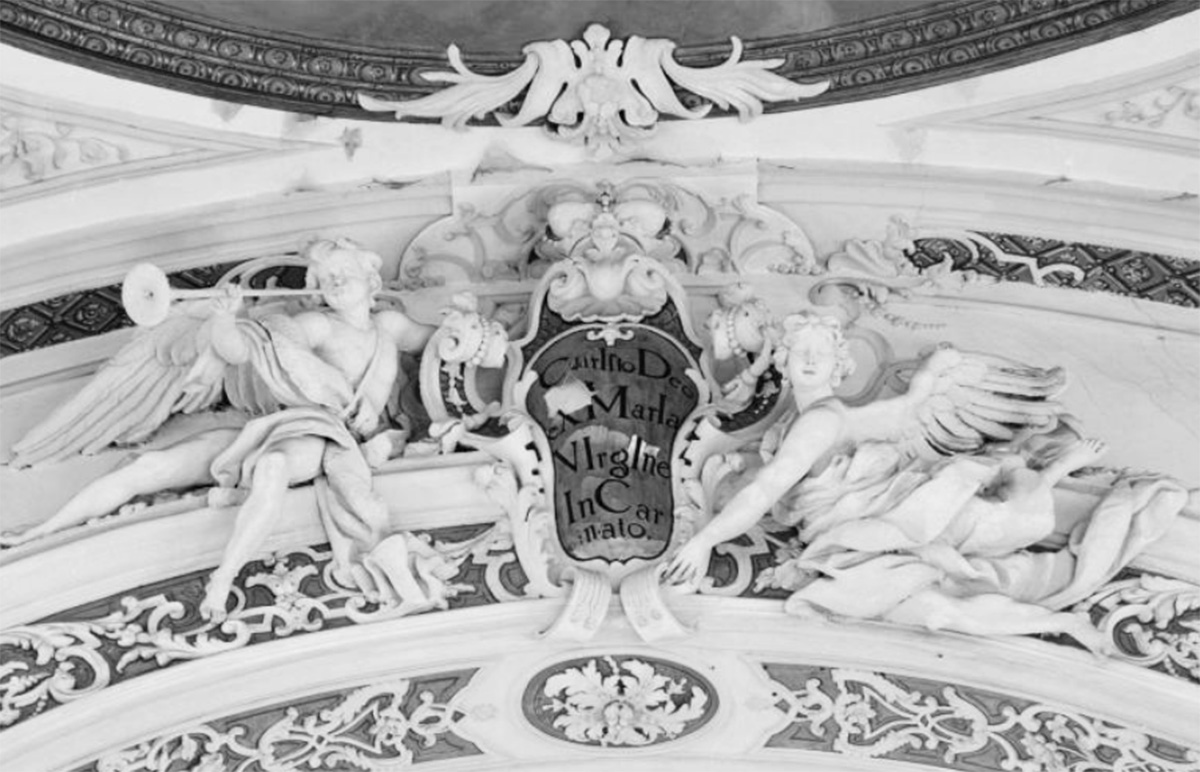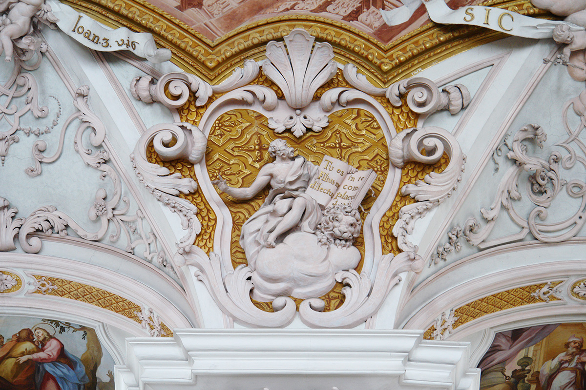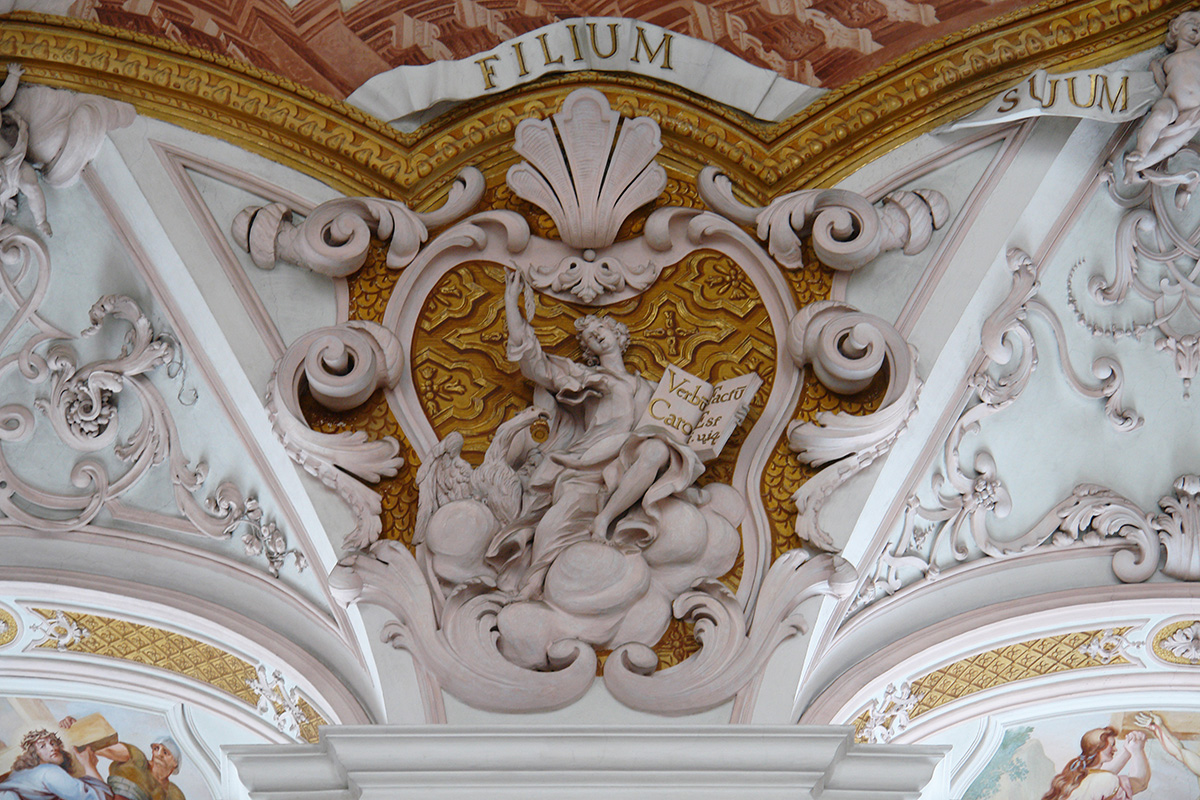 Über dem Chorbogen eine von zwei Engeln gehaltene Kartusche mit dem Chronogramm 1720 ("CrIsto Deo eX MarIa VIrgIne InCarnato", Christus, dem Gottessohn, der in der Jungfrau Maria Fleisch angenommen hat). Die Stuckaturen stehen in Rosatönung auf Weiß. Die Gurten haben Goldbrokathintergrund, die Gemälderahmen sind in Gelb und Braun mit Gold getönt.