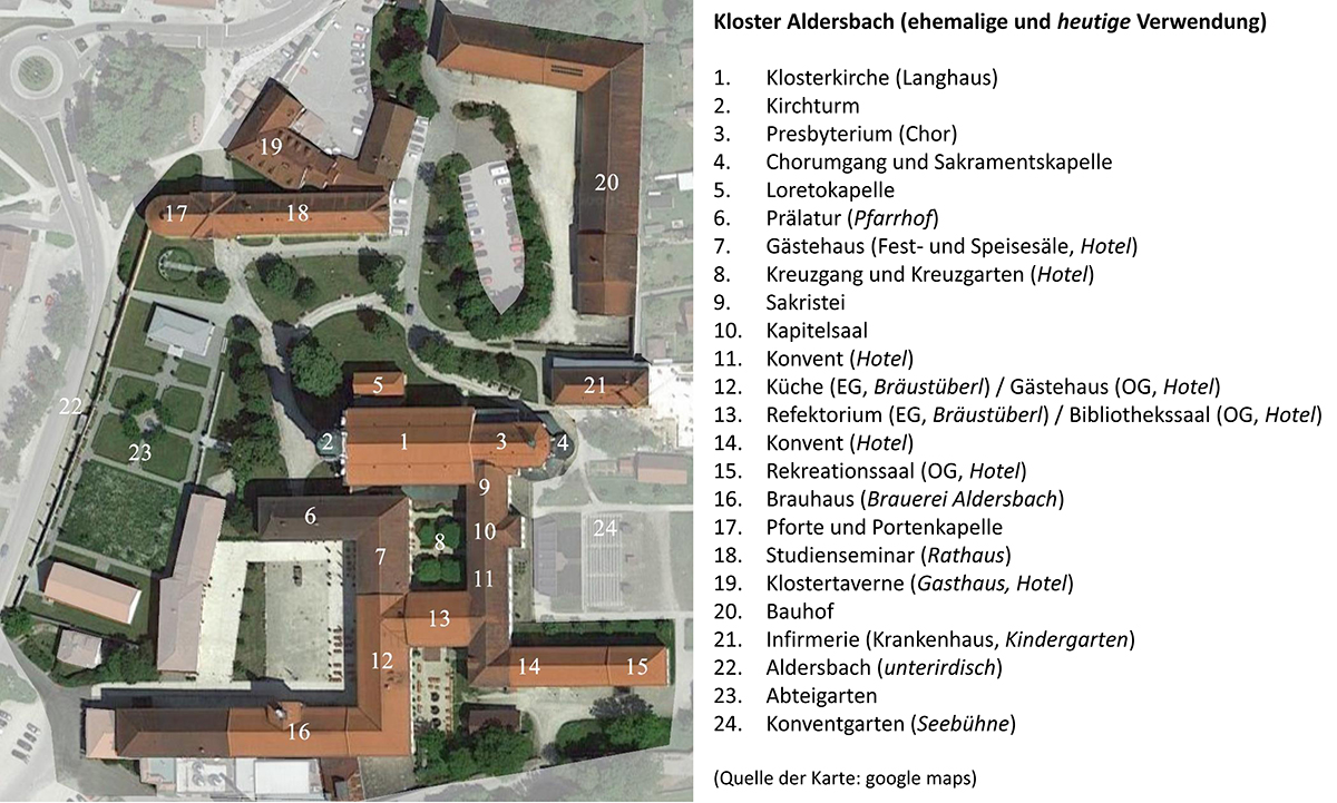 Als Grundlage für die Beschreibung der Konventbauten diente die diesbzgl. Publikation von Felix Mader in den "Kunstdenkmälern von Niederbayern" (Bd. 14, Bezirksamt Vilshofen, München 1920). Die Inhalte wurden, wenn notwendig, aktualisiert und korrigiert. Die Informationen zur Geschichte der Konventbauten nach der Säkularisation gehen auf den Artikel "Das Zisterzienserkloster Aldersbach" von Hubert Kalhammer zurück (in: Robert Klugseder: 850 Jahre Zisterzienserkloster Aldersbach, Vilshofen 1996, 23-25".