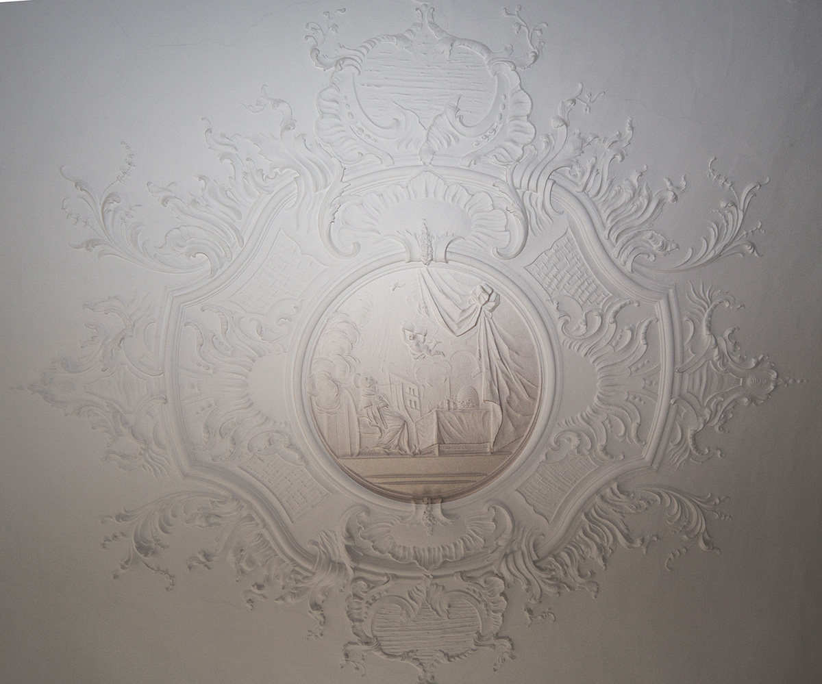 Im sog. "Roten Salon" (Saal) an der Nordwestecke, mit drei zu zwei Fensterachsen. Die Decke ist reich und geschmackvoll stuckiert. Die Stuckaturen wurden offensichtlich 1746 oder 1747 ausgeführt. Damals arbeitete der Stuckateur Johann Baptist Modler aus Kößlarn in Aldersbach, wie aus einem Baumanuale des Klosters Fürstenzell hervorgeht. Von ihm stammt jedenfalls nicht nur die Saaldecke, sondern auch die Decke des vorausgehenden Zimmers. Die Mitte der Decke nimmt ein stuckiertes Medaillon ein: An einem Studiertisch sitzt ein Zisterzienser, daneben ein Bienenkorb. Die vier Mittelmedaillons der Umrahmung stellen die vier Jahreszeiten mit landschaftlichen Szenerien dar. Der Dekor verwendet barock empfundenes Muschelwerk mit Drachen und Schwänen, auch Springbrunnen. An der Südwestecke Portal zur anstoßenden Privatkapelle des Abtes mit Stuckumrahmung. In der Bekrönung das Auge Gottes: DEUS OMNIA VIDET (Gott sieht alles) und zwei Putten.