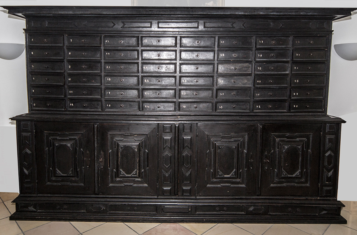 Im Vorraum ist heute der ehemalige "Registratur-Kasten" des Abtes aufgestellt. Die Registratur war ursprünglich ein separater Raum in der Prälatur, in dem man einen Teil des Klostersarchivs mit aktuellen Dokumenten verwahrte. Der schwarz gefasste und barock verzierte Schrank dürfte um das Jahr 1700 hergestellt worden sein. Auf diesem Schrank steht heute ein Porträtgemälde des Abtes Theobald II. Reitwinkler (reg. 1745-79). Auf dem vergoldeten Rahmen sind die Wappen des Klosters und des Abtes zu erkennen.