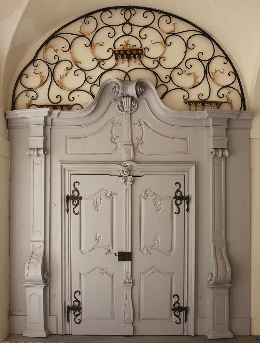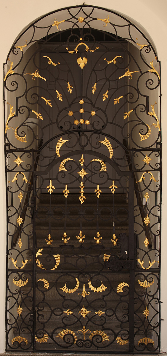 Die Fenster des Erdgeschosses gegen Norden haben Eisengitter mit je einer formenreichen Blume. – Den Stiegenaufgang schließt ein gutes Spätrokokogitter.