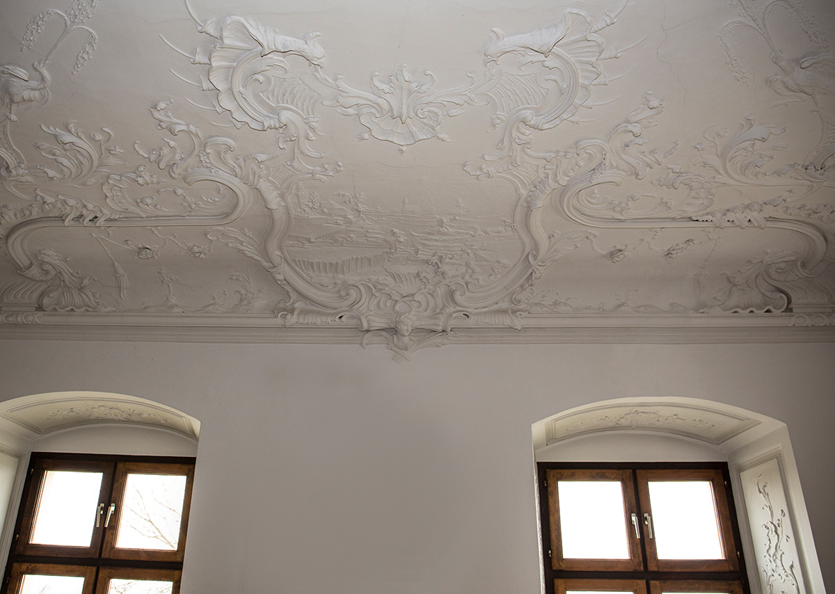 Im zweiten Obergeschoss befanden sich Gastzimmer. Hier zwei Zimmer mit stuckierten Decken. 1. In der Mitte Sonne. Den Deckenspiegel umrahmt Muschelwerk mit Eck- und Mittelkartuschen. Die Eckkartuschen springen obeliskenförmig vor. – 2. Ecksaal. Die Stuckierung ist nächstverwandt mit den Stuckaturen einiger Zimmer der neuen Residenz in Passau, die Modler um 1768 ausführte. Das vom Gesims ausgehende Rocaillewerk greift tief in den Deckenspiegel ein, wie in mehreren Zimmern der Passauer Residenz. Mit dem Muschelwerk verbinden sich kleine Blumen- und Strauchmotive.
