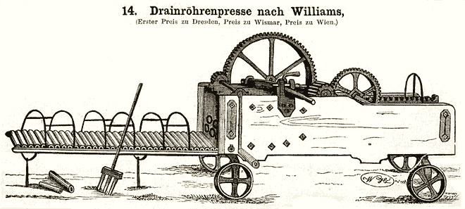 In einem Gemache des Erdgeschoßes war eine Drainageröhrenpresse aufgestellt worden, welche der Herr Baron arbeiten ließ. In kurzer Zeit waren einige Röhren fertig, nur noch des Brennens bedürftig. Mit einigem Widerstreben folgte man der Einladung, eine Treppe höher zu steigen. Kleidung und Stiefel waren schon nicht mehr in anständiger Verfassung. Im Speisesaale waren Bier, Brod und kalte Küche zur Erquickung der Gäste bereitet, zu deren Genuß der Herr Baron dieselben herzlichst auf forderte. Diesen ward hier auch die Freude, die Frau Baronesse Gemahlin zu sehen, welche wegen des Ablebens ihres Herrn Vaters des k. Generallieutenants Freiherrn von Gumpenberg noch in Trauerkleidung erschien. Dieselbe unterhielt sich freundlich mit den Anwesenden. Mit ihr waren auch einige liebenswürdige Kinder gekommen, welche sich zutraulich unter die Gäste mischten. Ein Theil der Letztern benützte die kurze Zeit, um auch die ein Stockwerk höher in 2 Sälen aufgestellte bändereiche Bibliothek, alle Zweige des menschlichen Wissens umfassend, zu sehen. Man mußte sich in eine öffentliche Bibliothek versetzt glauben, und doch war es nur ein Theil der Bücher, ein anderer Theil, besonders theologische Werke enthaltend, ist in Allersbach aufgestellt.