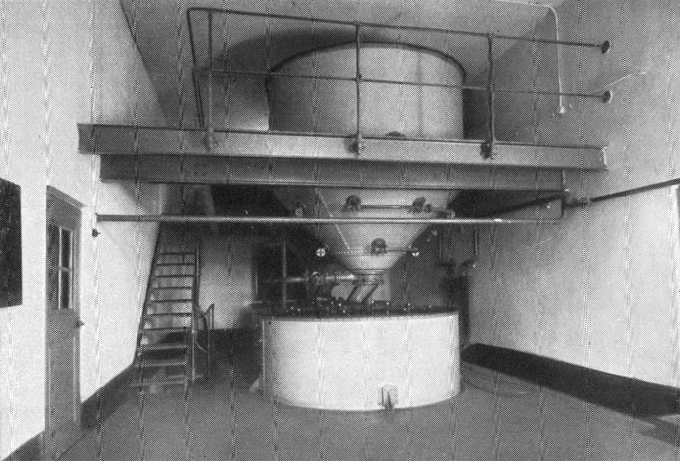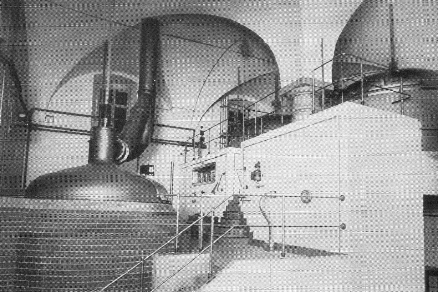 Nach diesem abwechslungsreichen „Spaziergang" sind wir wieder unten zu ebener Erde. Vorbei an der (S. 26) Filtermasse-Wäscherei kommen wir in das Sudhaus, ein Doppel-Sudwerk für 30 Zentner Schüttung, das Mauerwerk mit Fliesenverkleidung, und zwar die Würzeseite vor zwei Jahren von F.J. Sommer Landshut, die Maischeseite von der Maschinenfabrik M.A.N. Augsburg vor drei Jahren geliefert.