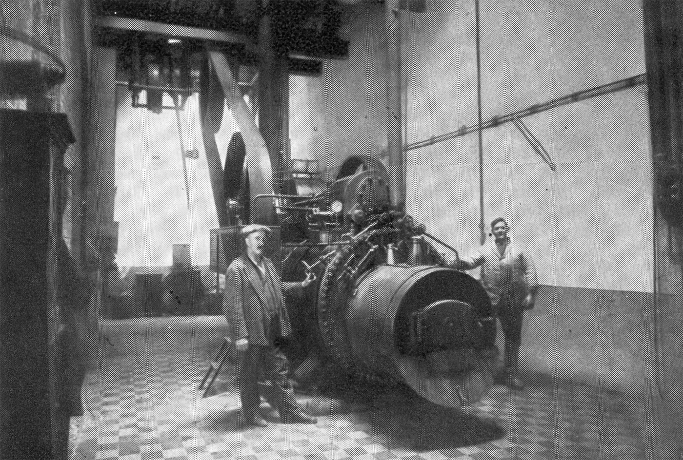 Und nun machen wir einen Rundgang durch die Brauerei, die mit ihren ausgedehnten Anlagen und ihrer auf den letzten technischen Stand gebrachten maschinellen Einrichtung jedem Fachmann Hochachtung abnötigt. Wir stehen zunächst noch im Freien, am Fuße des Schlossberges, um den sich der Aldersbach windet. Dieses aus der Pfarrkirchner Richtung kommende Gewässer mag früher hier wohl die Mühle der Zisterzienser getrieben haben. Heute ist seine Wasserkraft der Brauerei dienstbar gemacht durch zwei Turbinen, welche Voit Heidenheim a. Br. geliefert hat. Etwas bergaufwärts sehen wir die Eisgerüste zur Erzeugung von Natureis, das von den Gerüsten unmittelbar in den 4000 Zentner fassenden Eiskeller wandert. Von da geht es in die Treber-Trocknungsanlage. Die Trockentreber wird durch ein Gebläse in ein Silo befördert, in dem 500 Zentner Raum finden. Nebenan treten wir in das Maschinen- und Kesselhaus. Wir finden hier eine Einzylinder-Dampfmaschine mit 80 PS, gekuppelt mit zwei Ammoniak-Kompressoren von je 65000 Kalorien Stundenleistung, von der Gesellschaft Lindes Eis-Maschinen, Filiale München, aufgestellt, sowie eine Lokomobile für Heißdampf, 90 PS, Fabrikat Heinrich Lanz Mannheim und einen Zweiflammrohr-Dampfkessel.