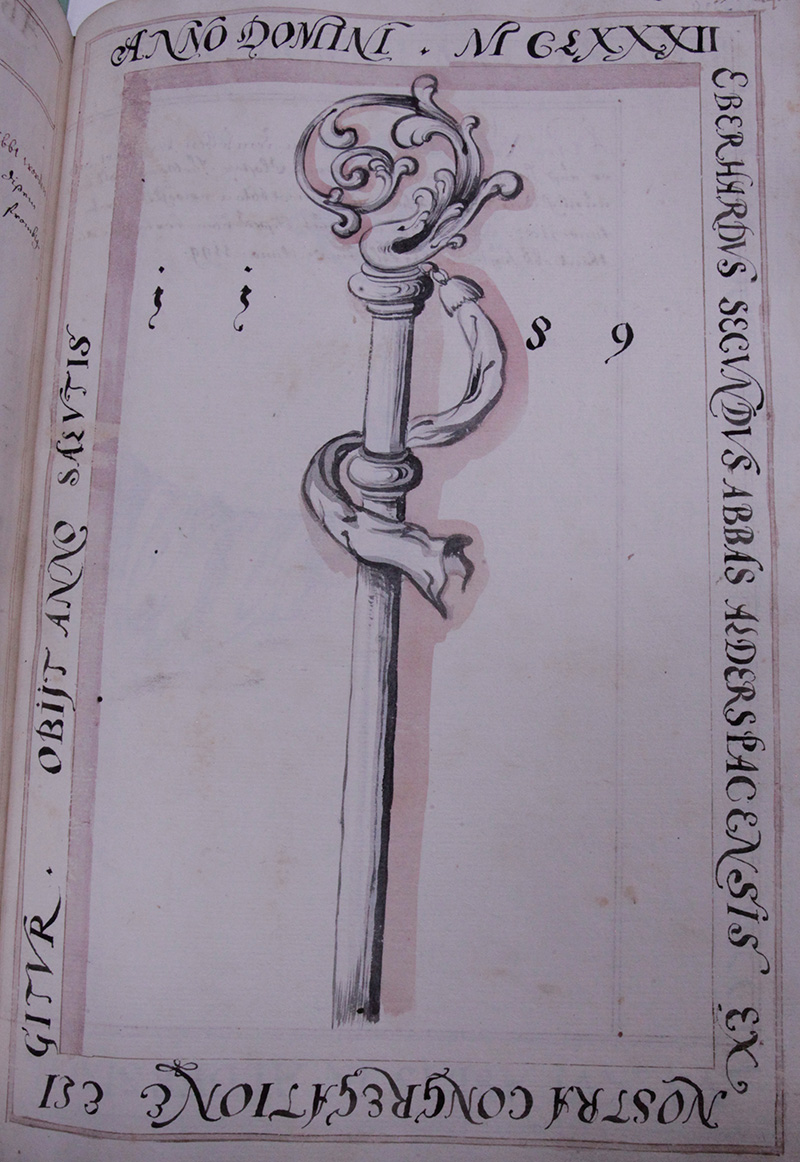 [Übersetzung ChatGPT: Theobaldus, der erste Abt mit diesem Namen und 43. Abt insgesamt, wurde unter dem Namen Grad während der Zeit gewählt, als der Römische Kaiser Joseph I. Bayern mit seinen Streitkräften besetzt hatte, nämlich im Jahr 1705. Unter dem Schutz des hochwürdigen Herrn Abt Stephan von Salem und der Assistenz des hochwürdigen Herrn Abt Abbund von Fürstenzell wurde der vorherige Prior am 21. Oktober einstimmig zum Abt dieses Klosters gewählt. Nach der Weihe durch den Abt von Salem gemäß den Privilegien des Ordens und den bayerischen Konkordaten wurde der neu gewählte Abt nach der Verkündigung des Kaisers den kaiserlichen Kommissaren vorgestellt. Der hochwürdige von Constannte, Dekan der Münchner Kollegiatkirche und kaiserliche Kommissar für die Zeit empfand dies jedoch als widersprüchlich und verbot dem neu gewählten Abt daraufhin die Verwaltung der weltlichen Angelegenheiten. Darüber hinaus erhielt der neu gewählte Abt aufgrund der Kriegswirren im [Kloster] Stams in Tirol ohne Zustimmung des Münchener Kirchenrats den Segen und bot so Anlass für neue Kontroversen. Der Streit um das Recht der Verwaltung der weltlichen Angelegenheiten dauerte bis 1707, wobei Rom zustimmte und der Kaiser ablehnte. Schließlich trat Wilhelm, der Abt von Ebrach, als unmittelbarer Vater auf, um größere Schäden für das Kloster abzuwenden, und erreichte nach demütigen Bitten beim Grafen von Lewenstein, dem damaligen Verwalter unseres Klosters, dass der Gewählte in der Verwaltung der weltlichen Angelegenheiten eingesetzt wurde. Dieser Abt regierte später sehr glücklich und richtete mit den Einkünften, die er als Provinzdelegierter über viele Jahre gesammelt hatte, unsere Kirche von Grund auf neu her und schmückte sie mit neuen Malereien Asams. Er erweiterte das heilige Inventar, baute die Abtei und Unterkünfte für Gäste von Grund auf neu, und überall wurde er als Vater der Armen gehört. Als Marienverehrer sorgte er dafür, dass die Filialkirche in Frauentödtling in eine moderne Form gebracht wurde. Ein Mann voll des Geistes Elias, aber dennoch der Demütigste von allen, gab am 21. Februar 1734 um 17 Uhr abends seinen Geist dem Schöpfer zurück.]