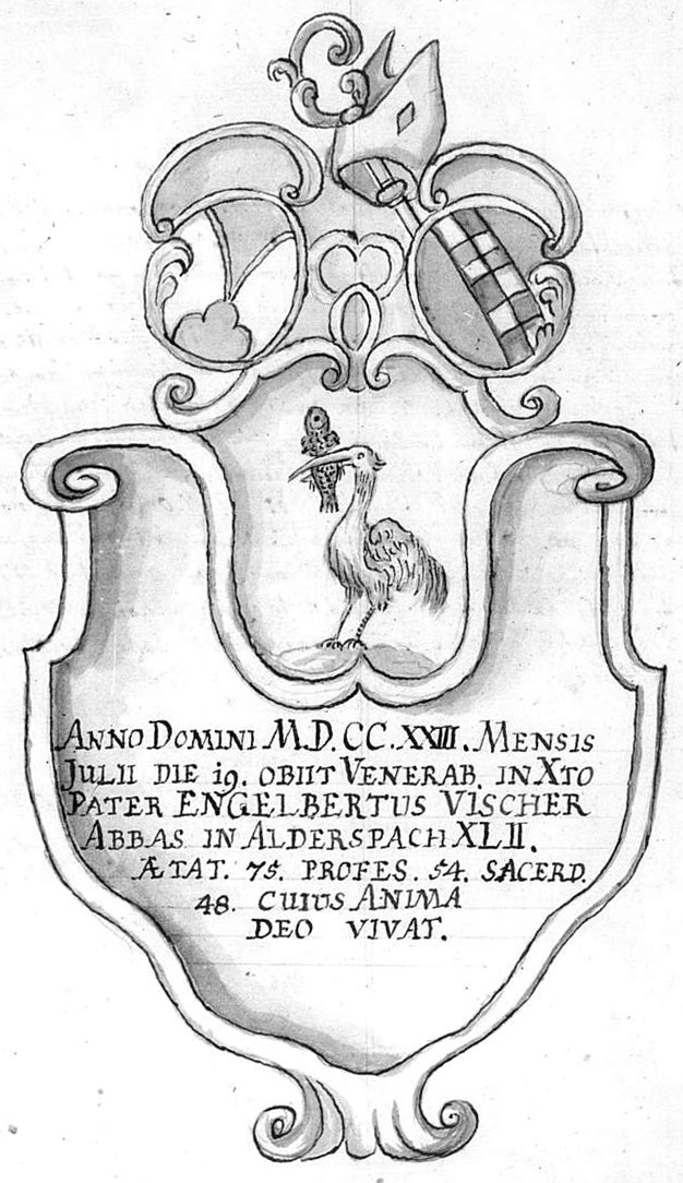 Reverendissimus Engelbertus Abbas 42. cognomento Vischer de Viechtach oriundus Anno .1683. in Dominica, Sexagesimæ electus est. Studia Religiosorum tam domestica, quam academica fovit et promovit. Domum novam pro Religiosis ad B. V. M. in Samarey funditus erexit. Sacellum Marianum ibidem Novo altari decoravit, in ipso Monasterio novum Dormitorium ædificare cœpit, et plagam australem ejusdem ædificii magnis impensis absolvit. Ecclesiae ornatum 6. Candelabris argenteis majoribus et .4. Minoribus, statua Crucifixi aliisque pluribus vasis argenteis adauxit. Bibliothecam pretiosis voluminibus ampliavit, et his expletis sinistram fortunam declinans abbatiam ad 1705. die 17. Octobris Liber resignavit, ac reliquæ vitæ suæ di? Samaryæ pie consummavit. Tandemque Sub umbra alarum beneficia Matris ibidem in pace quievit anno 1723. Translatus ex Samarey requiescat ante gradum chori in navi Ecclesiæ. Monumentum autem ejus in Cathacumba ex parte Chori Prioris conspicitur.