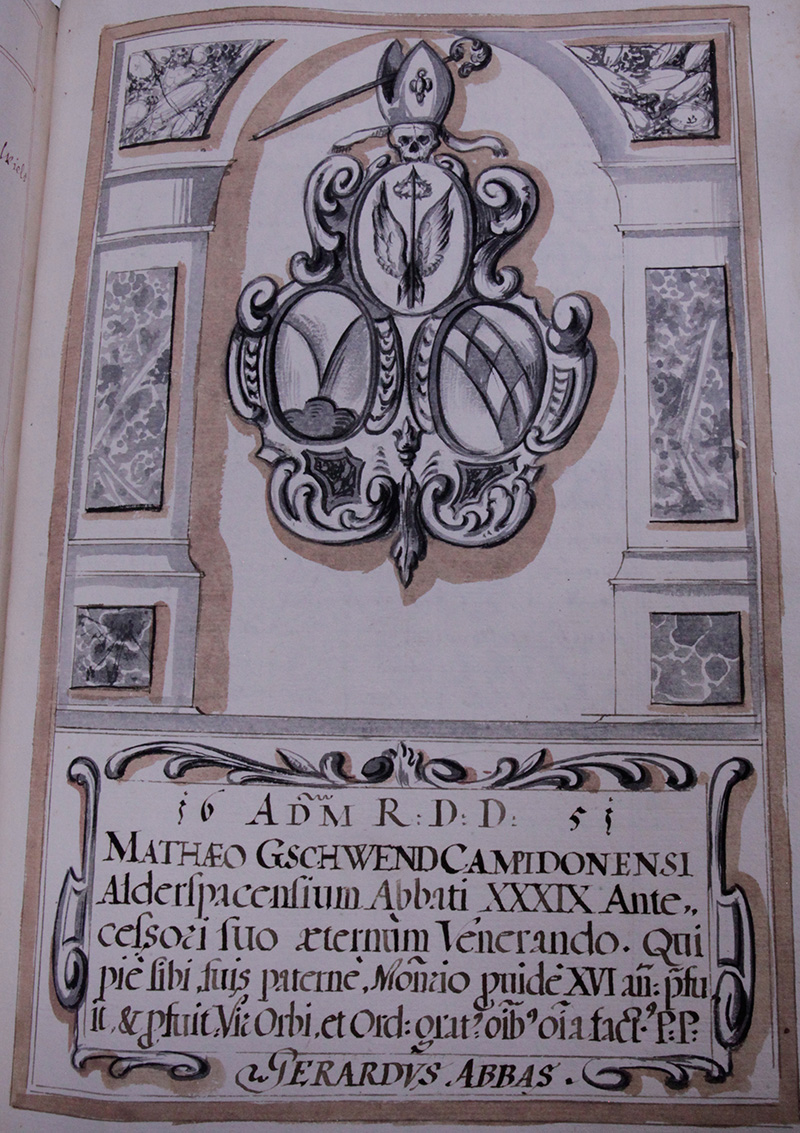 Im Jahr .1651. hat disen Grabstain guettmainent aufgericht, dem Hochwürdtigen Herrn Herrn Matthaeo Gschwendt von Kembten dem .39. Abbten zu Alderspach, seinem vorfahrer, zur unendtlichen Ehr. Welcher ihme selbsten Gott seeliglich, den seinigen vätterlich, dem Closter vorsichtiglich .16. Jahr vorgestandten, unnd nuzgebracht, ein mann der Weld und dem orden angenemb, so allen alles worden ist guettmainent aufgericht Abbt Gerard, diser Herr ist im Jahr .1635. den .15. Julii undter dem Praesidenten Herrn Daniel Adam Abbten zu Rottenhaßlach unnd Assistenten Herrn Wolfganng zu Fürstenzell nahent mit ainsammer stimm rechtmessig zu den Abbteylichen würden dises Closters erwöhlt worden, ware zuvor Prior ein Herr sehr sanfftmüettig, und doch nit ohne eyfferige aufsicht in erhaltung der clösterlichen Regular Disciplin eines Jungfreylichen unnd schamhafften gemiets, einer sonderlichen diemuet, doch mit annemblicher Freundlichkheit, seinem standt nach nit ohne rechtmessige geberden: nach etlich starckherlittenen Ruin deß Laydigen Kriegs ist er von einem Catharr erkhrenckht worden mit höchsten Layd der seinigen morgens frue zwischen .4. und 5. uhr den .1. Februarii Anno .1651. nach zwaytägigem geliger erstikht worden.