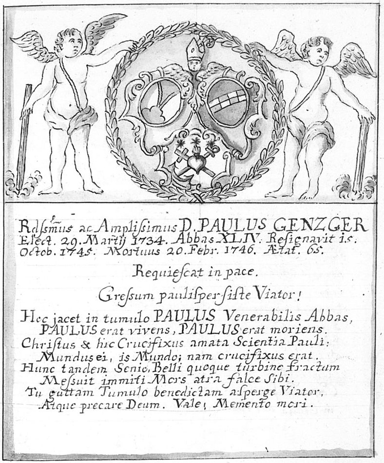 Recererdissimus Dominus Dominus Paulus, cognomento Genzger, die 29.na Martii 1734. Antecessori in Regimine canonice Successit. Vis literatus, et Musices peritissimus. Subsequo Electionis suæ anno Parochiam in Valle Vulturu /:Cui ad Sua usque tempora Sæculares Clerici præficiebantur:/ vindicare volens, per Causidicum Romæ agere cœpit, sed finem Causæ non Supervixit. plurimum pro Domo laboravit. Praxatoriam, Molendinum, Officina ac Equorum Stabula funditus errexit. Bibliothecam novis Editionibus auxit, ac Studia tum in = quam extra Monasterium multum promovit. in hoc autem ejus æconomica vigilantia excessit, Officinam Coriariam exstruendo. Vicinis et domesticis offendiculo erat: ita quidem, ut re ad altius tribunal delata, hæc ipsa officina funditus demoliri debuit. ex quo bella intrinseca cœpere, acita præval vere, ut bonum Abbatem coegerint pro servanda animarum Salute in manus Referendissimi Patris immediati Domini Domini Hieronymi de Eberach abbatie Munus libere resignare, vixit dein ut resignatus Abbas apud Thanimaturgam Virginem in Samarey tern domesticam Aministrando. sibi et fatis cessit de 20. Februaris 1746. Corpus defuncti ad gremium translatum requiescit in Cripta Sub isto depicto Marmore.