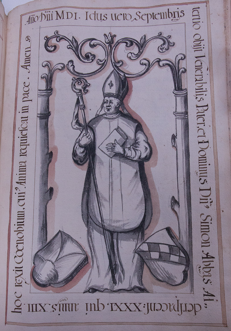 Im jahr .1501. Septembris .11. starb der Hochwürdige Vatter unnd Herr Simon Abbt zu Alderspach der .31. welcher .15. jahr .6. monath diß Closter Regirt dessen Seel ruhe in dem frieden. Diser Herr war gebürtig von Kästn bey Eggenfelden, zur selben Zeit versache unnßer Pfarr Eckhlhaimb: wurdte erwöhlt zum Abbten im jahr .1486. den .25. Martii. Ein frommer Mann mitlmässiger statur aber eines vortrefflichen ansechens, solcher ehr unnd standts wol würdtig: zu lezt seines alters ist er schwärer Kranckheitt halber etwas von sünen kommen, doch vber .60. jahr all worden, ist begraben vor Sanct Joannis Altar.