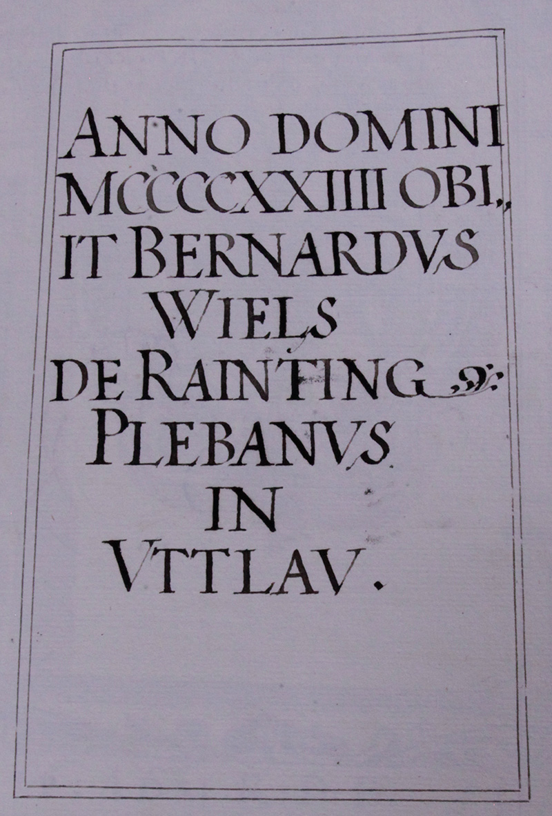Im Jahr 1424. ist verschiden Bernard Wiels von Raintting seelsorger in Uttlau.