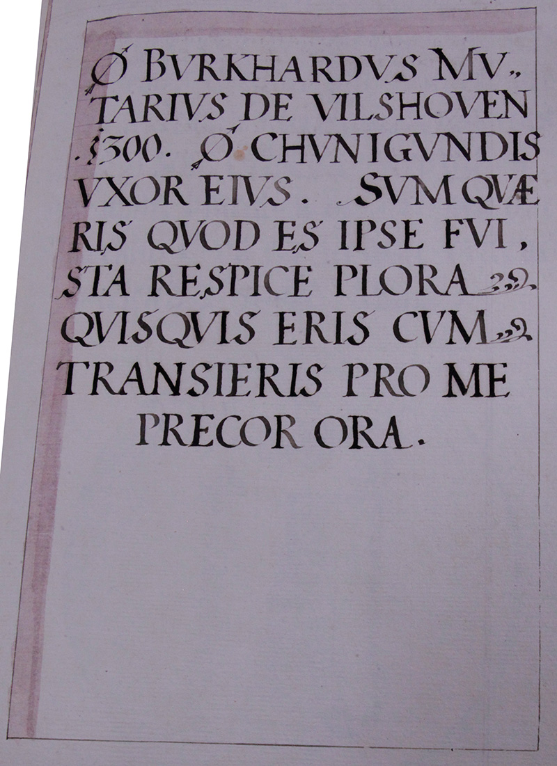 Es ist verschiden Burchardt Mauttner von Vilßhoven im Jahr .1300. Chunigundt sein Hausfrau Waß ich bin, fragstu? waß du bist bin ich selbsten gewesen, stehe, siche umb dich, bewaine waß du sein würst, wann du wirst verganngen sein, bitte dich, bette für mich.