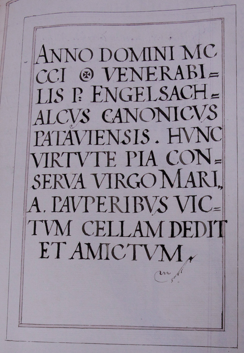 Im jahr .1301. verbliche Todts Herr Magister Englschalckh Doctor Decretorum Herr zu Passau, disen o Jungfrau Maria erhalte mit deiner güettigen crafft, Er hat alhie den armen geben die wohnung, Klaidung, und lebens mittl, hat gestüfft zu Trost seiner seel und der seinigen zum Spital alhier für .12. schwache und Kranckhe solche zuversechen ein speiß unnd Tranckh und Klaidung 300. Regenspurger Pfunnd anno .1294.