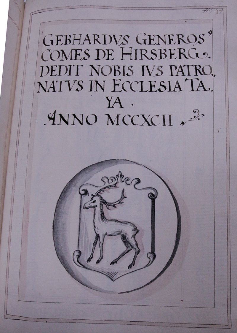 Gebhardus von Gottes Gnaden Graf von Hirschberg hat hergeschenckht daß jus Patronatus so demselben unnd seinen voreltern rechs wegen gebürt zu Teya der Pfarr, Passauer Pistumbs in Österreich. Anno .1292.