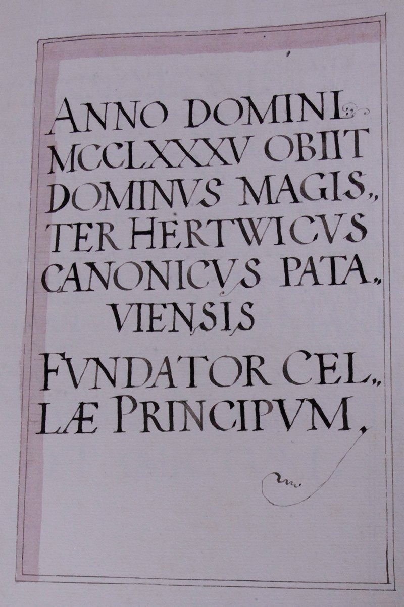Im Jahr .1285. hat sein leben geendet Herr Magister Hartwich Thumbherr zu Passau, so anfangs daß Closter Fürstenzell gestüfftet, dißer Herr hat von seinem aigenthomblichen vermögen gekhaufft ein guett zu Walxing iährlichen Diensts Korn .2. Habern .2. schaff Landauer maß, so an unßerm Closter gantz aigenthomblich, wie er es gekhauft ubergeben hat umb einen Jahrtag, mit Consens Pischoffs Otto zu Passau und erthailtem brief neben gnuegsamen zaigung Anno .1260. den .6. Februar. Item hat er unß erthailt .24. lb. Regenspurger, für welche wür nach seinen begehren erkhaufft haben ein guett bey Ratolstorff genant zum aigen, und ein hueb in Hefft, welche nach seinem Todt unnß gantz aigen und frey auß freygebigkheit obbenanten Herrnen zu Hayl seiner Seelen aller seiner voreltern unnd allen Christglaubigen abgestorbnen Anno .1264. den .7. Junii. Ottone Pischoff zu Passau den .9. Theodorico Abbten in Alderspach.