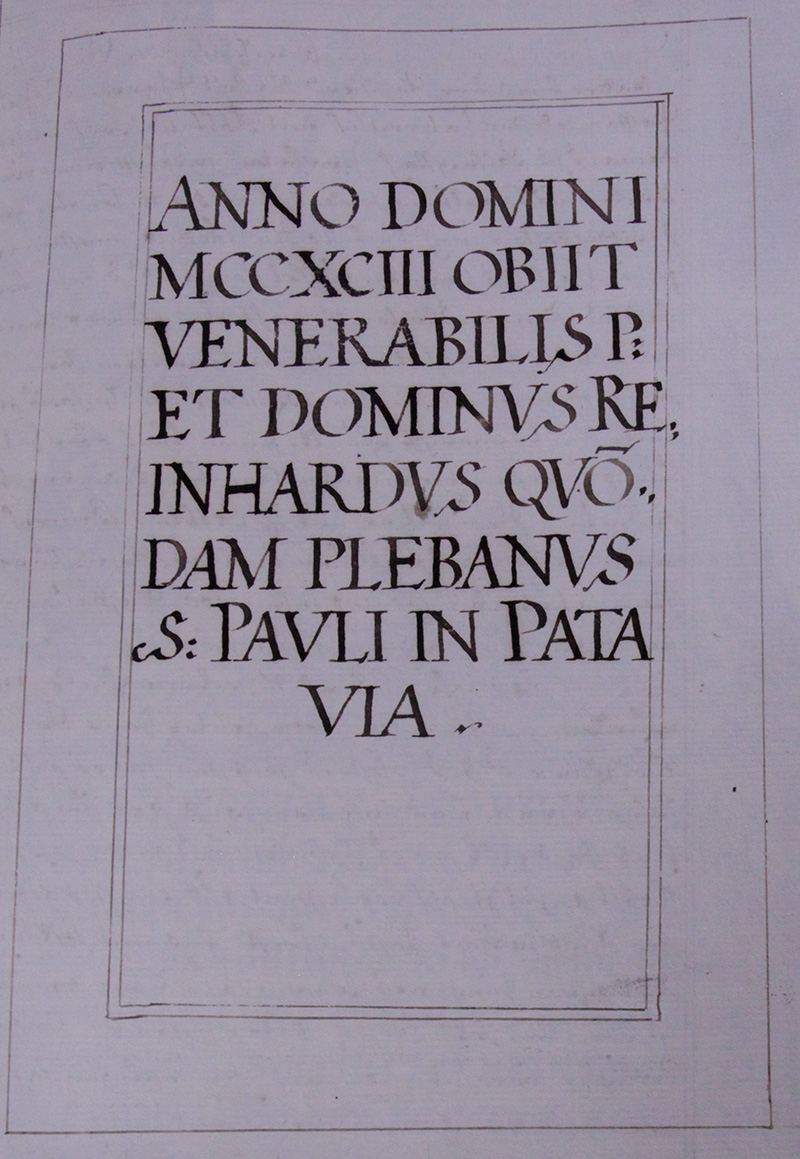 Im Jahr deß Herrn .1293. ist verschiden der Ehrwürdtige Vatter und Herr Reinhardt zur Zeit Pfarer Sancti Pauli in Passau, diser hat erstlich mit Abbt Heinrich von Ebrach damals zu Alderspach Praelaten gekhaufft einen Weinberg bey Krembs Wartberg genant umb .58. lb. hat aber weegen strittigkheiten noch umb .20. lb. redemiert müessen werden, seinen Thaill des Weinbergs, hat Reinardus dahin verordnet, daß zu Sommerzeiten zu nacht dem Convent wein gegeben wurdte. Item hat er mit vorbenentem Herrn Abbten gerkhaufft einen Hof in Gneissendorf der Michaels genant umb .72. Wienerische pfundt: seinen Thaill aber hat Reinardus zum Bauweßen vorbenanten Weinpergs im Wartberg verordnet. Item hat er mit Herrn Abbten Hainrich erkhaufft einen Hof zu Wolferthoven umb .64. Regenspurger lb. Item hat er dem Convent geben .100. Passauer Ib. daß von disem unnd seinem außgegebnen Thaill an vorbenantem Hof durch das jahr hindurch zu jedem mahl .3. ayr gegeben wurdten. Item weill obbenanter Herr Reinard ein gar guetgüner dises Closters geweßen, hat er sich von Passau hieher begeben, und in einem haus, so er ihm selbst erbaut, umb das endt seines frommen und Erbaren Wandls, unßern habit angelegt, sich verlassen auf unßer gebett undter der Güettigkheit Jesu Christi unnd mit hoffnung zur Seeligisten Jungfrau Mariae sein Leben geendet unnd ist vor dem Heiligen Creuz Altar begraben worden ist Seeliglich verschiden Anno 1293. Lestlichen hat er hieher vermacht sein ganzes Vermögen.