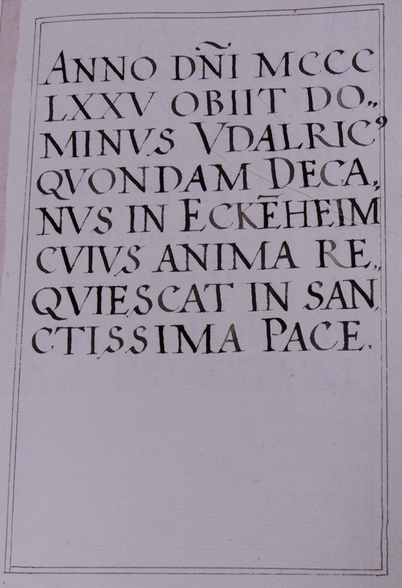 Im Jahr .1375. [korrekt: 05.11.1365] hat sein Zeitliches leben mit dem Ewigen vertauscht Herr Ulrich Juvor dichant in Egglhaim, dessen sell wolle ruhen im Höchsten frieden.