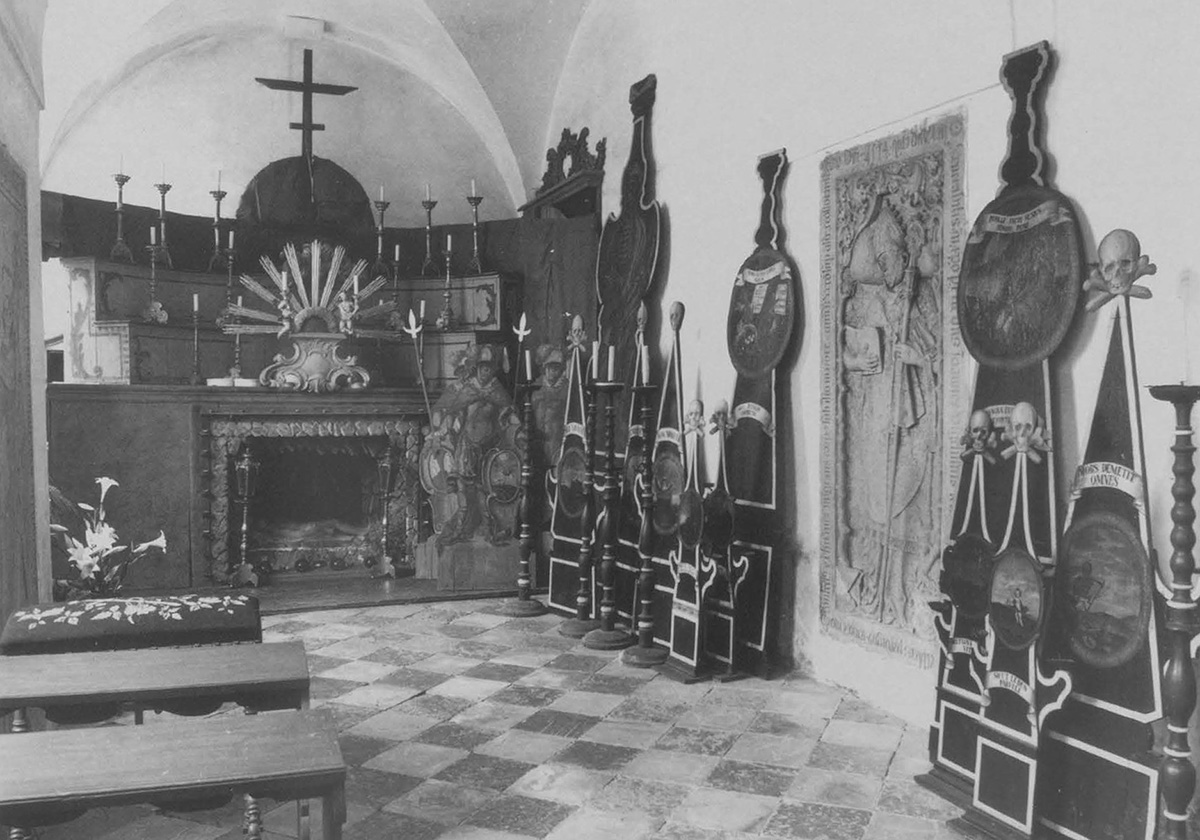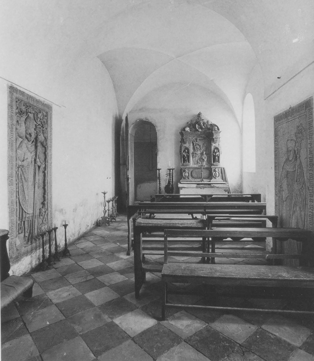 Bernhardskapelle heute Hl. Grabkapelle (links vom Presbyterium). Der Altaraufsatz ist in Kalkstein gemeißelt. Breite Pilaster, die in Muschelnischen die bemalten Terrakottafiguren der hll. Bernhard und Leonhard zeigen, flankieren ein Relief, das den Abt Michael Kirchberger (reg. 1612-1635) vor der Muttergottes kniend darstellt. Im Aufsatz zwischen Giebelschenkeln ist eine Mittelkartusche mit Relieffigur Gottvaters. Im Sockel findet sich eine Inschrift des Inhalts, dass Abt Michael Kirchberger die Kapelle und den Marmoraltar errichtet habe.