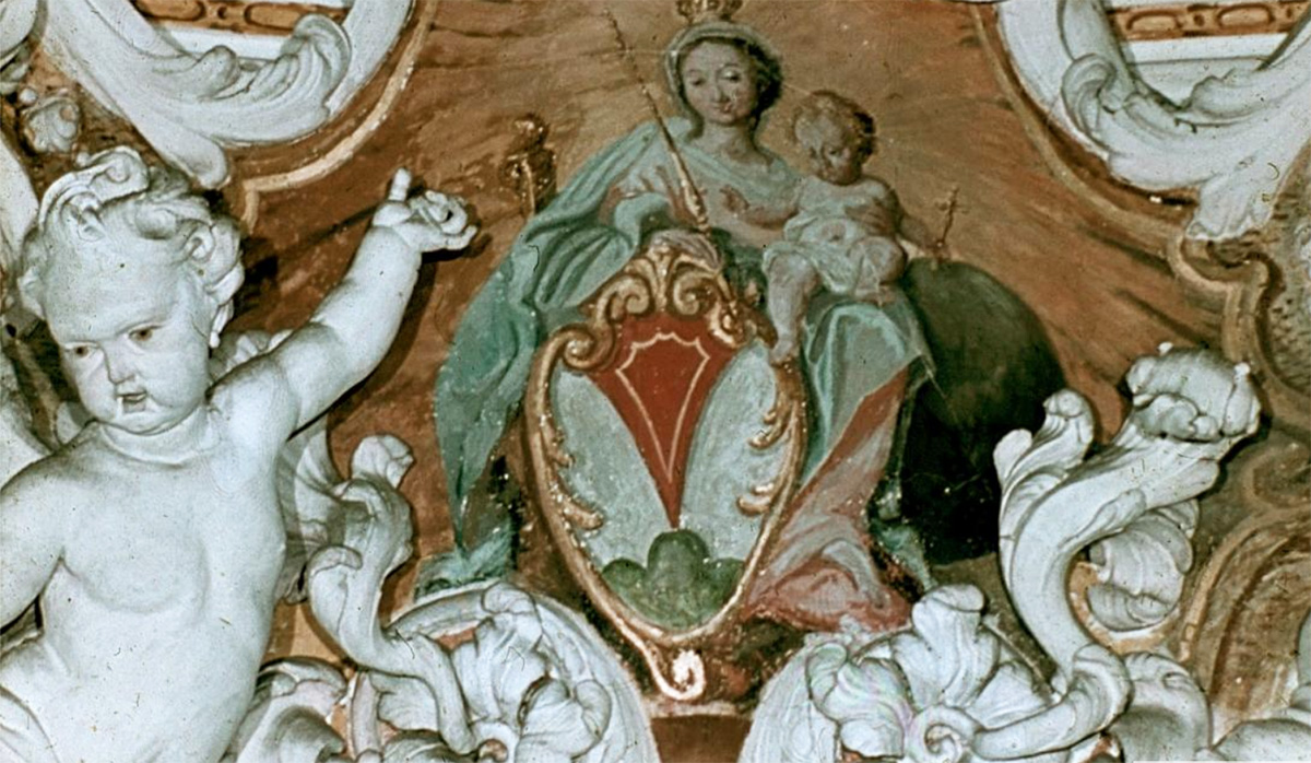 Mit größtem dekorativen Geschick ist die Orgelempore behandelt. Sie schweift in barockster Bewegung gegen die Mittelachse der Kirche vor. Zwei Binnenpfeiler tragen sie. Über diesen stützen Atlantenengel die Brüstung, die in der Mittelachse mit einer reichen Kartusche besetzt ist; letztere umschließt ein Gemälde der thronenden Himmelskönigin mit dem Klosterwappen. Weiterhin schmücken die Brüstung Rosettenfelder, die Zwischenflächen sind mit gelbem Brokat bemalt. Unterhalb der Orgelempore zieht sich eine schmale Empore an der Westwand der Kirche hin. Die geschweifte Vorkragung, auf der sie ruht, ist mit Bandwerk von etwas jüngerem Datum stuckiert. In der Mitte fällt ein kunstvolles Gehäuse auf, das ehemals dem Abt zur Adoration diente.