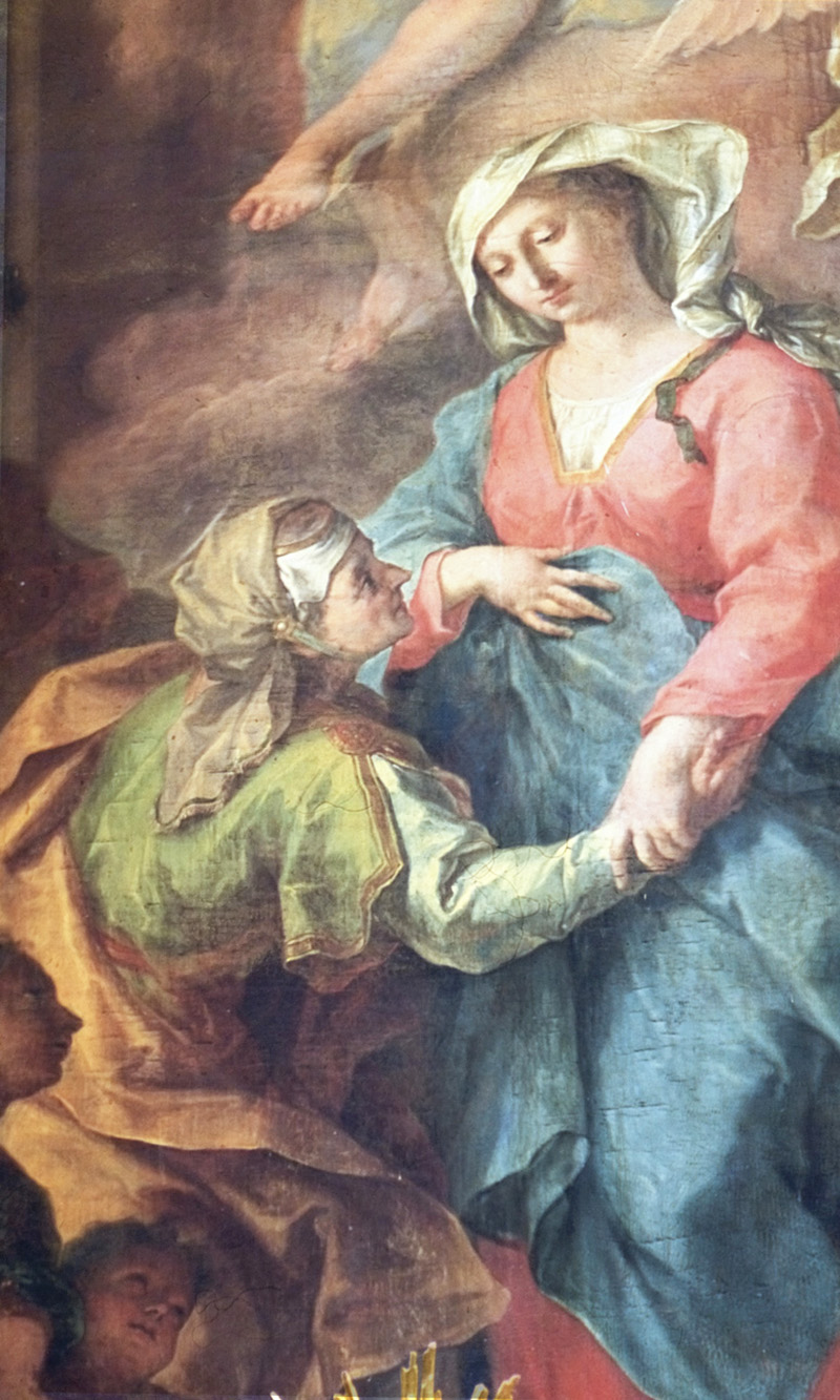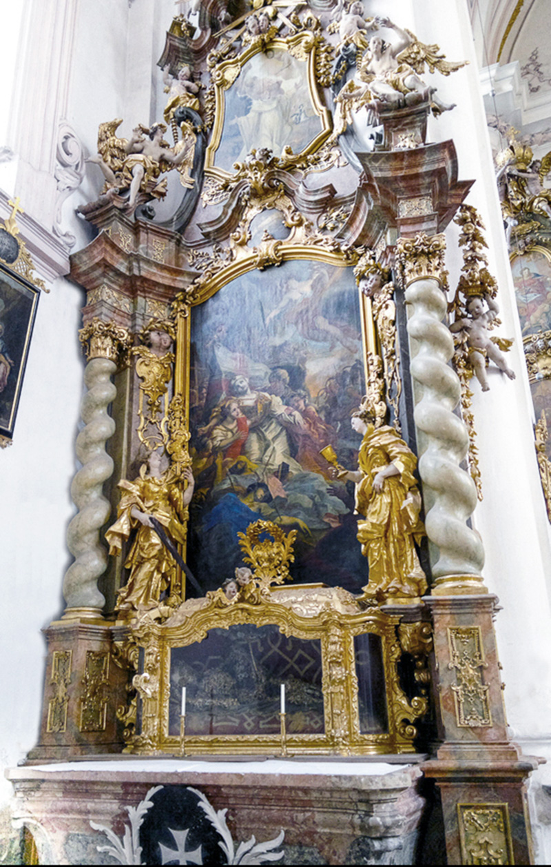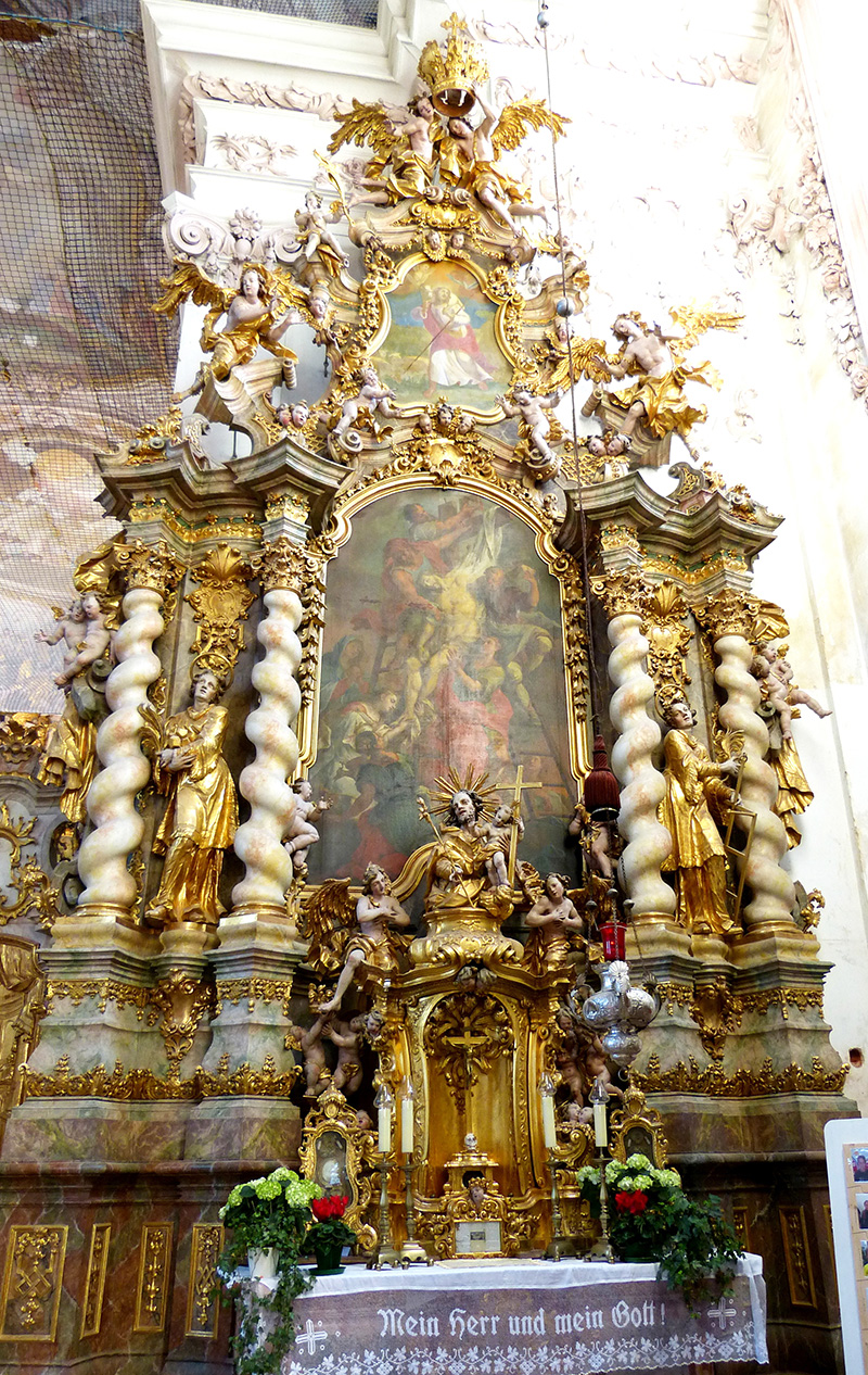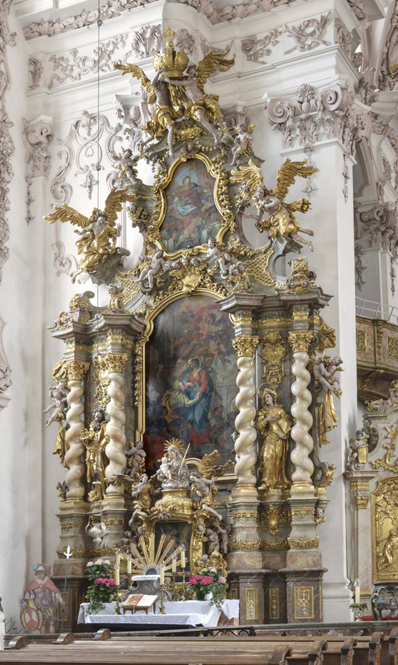 Kreuz- und Marienaltar: Innerhalb der marmornen Kommunionbank mit kunstvollen schmiedeeisernen Gittern erhebt sich rechts der Kreuzaltar oder Sakramentsaltar; das Ewige Licht deutet an, dass hier das Allerheiligste im Tabernakel steht. Auf der linken Seite der Marienaltar. Die Altarblätter zeigen die Jahreszahlen 1728 und 1729. Nach dem Stil zu schließen, stammen auch diese Altäre von Götz. Die Figuren gehören eher der Werkstatt von Wenzel Jorhan aus Griesbach an. Je vier gewundene Säulen, zwischen denen Seitenfiguren stehen, flankieren die Altarbilder. Die Bekrönung zeigt je ein Oberbild, das von großen und kleinen Engeln umgeben ist. Zwei große Engel halten über dem Scheitel in graziöser Bewegung eine Krone. Die Altarblätter stellen Maria Heimsuchung links und rechts die Kreuzabnahme nach Rubens dar. Beide wurden der Signatur zufolge von Johann Georg Bergmiller gemalt: "Bergmiller fecit Ao. 1728 bzw. 1729". Diese Altäre haben vorzüglich komponierte Drehtabernakel, darüber je eine Büste von Maria bzw. von Joseph. Letztere sind sicher Werke von Jorhan. Seitenfiguren am rechten Altar: Die Märtyrerdiakone Stephanus und Laurentius – Oberbild: der Gute Hirt. Seitenfiguren am Marienaltar: Joachim und Anna – Oberbild: Maria als Ordenspatronin.