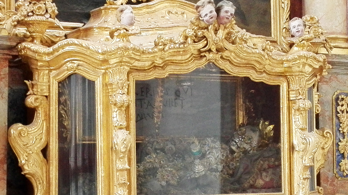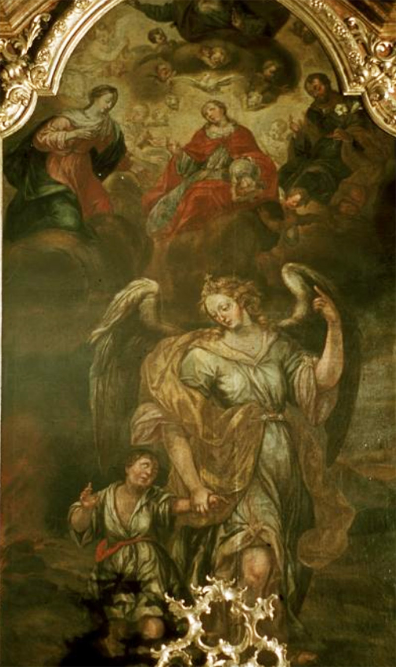 Schutzengelaltar (4. Altar links): Das große Bild mit dem Schutzengel stammt von Nikolaus Stuber. Darüber sehen wir den Schutzpatron gegen die Pest, den heiligen Rochus. Die Pest hatte nach dem 30jährigen Krieg 1649 in Aldersbach 110 Menschen hinweggerafft. Zwischen Reliquien findet sich die Figur des gegeißelten Heilands, wohl eine Nachbildung aus der Wieskirche.