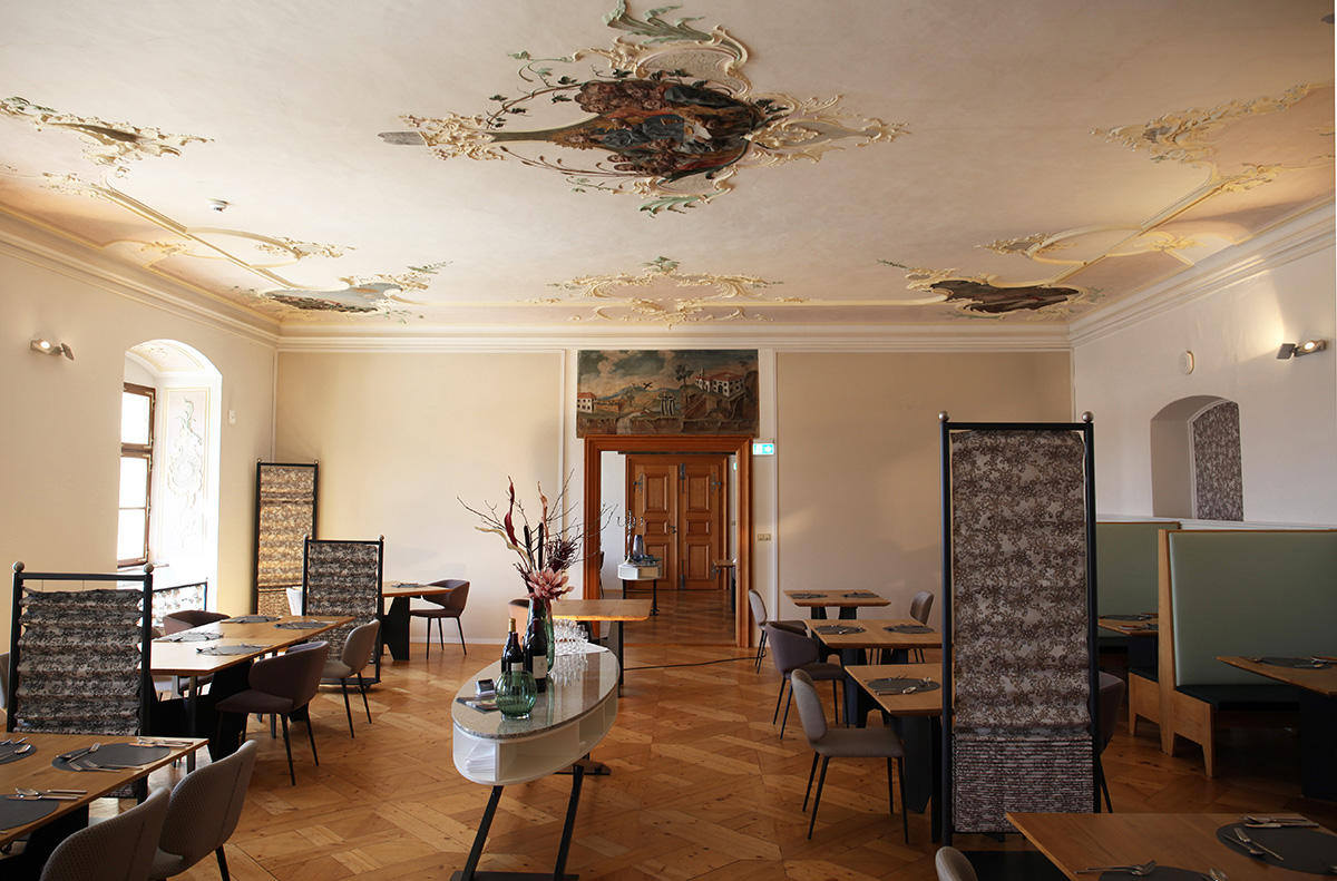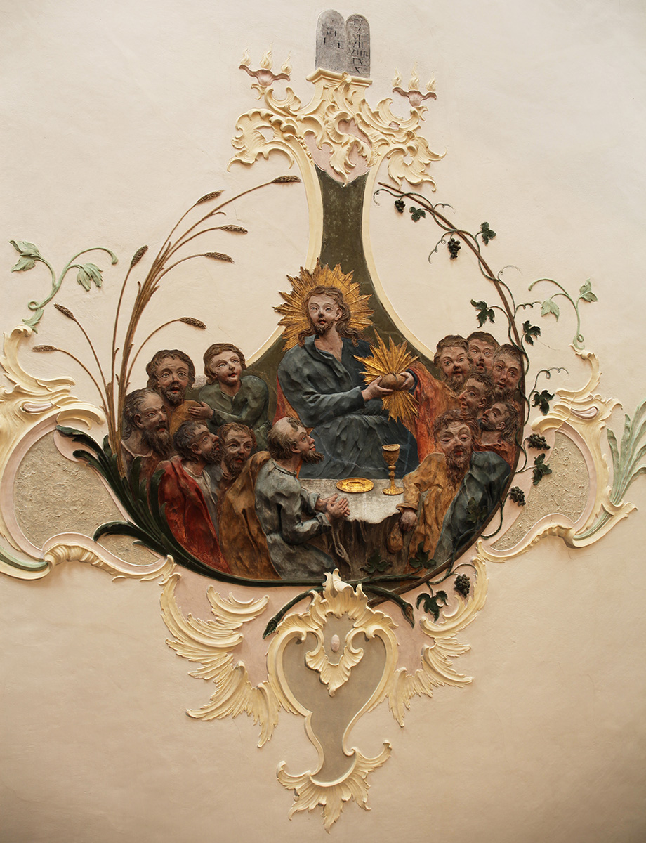 Erstes Speisezimmer (für den Abt): Der Raum hat drei Fensterachsen und eine Flachdecke. Flügeltürn mit Rechteckfeldern. Die Stuckierung gehört der Zeit um 1750 an. Sie stammt sicher von Johann Baptist Modler. In der Mitte der Decke stuckiertes Ovalrelief, das hl. Abendmahl darstellend, umgeben von Muschelwerk, Ähren und Weintrauben, bekrönt von den Gesetzestafeln. Die Umrahmung des Deckenspiegels beschränkt den Dekor im Wesentlichen auf Eck- und Mittelmedaillons. Die Eckmedaillons enthalten landschaftliche Szenerien in Stuck, die vier Jahreszeiten darstellend. Über den beiden Türn befinden sich stuckierte Supraporten: 1. Ein Rabe bringt dem Einsiedler Paulus für seinen Gast ein zweites Brot – 2. Ein Vogel bringt einem Mönch einen Fisch, damit er das Fastengebot einhalten könne. Die Stuckaturen sind gelb getönt, auf Rosagrund, die Reliefs farbig gefasst.