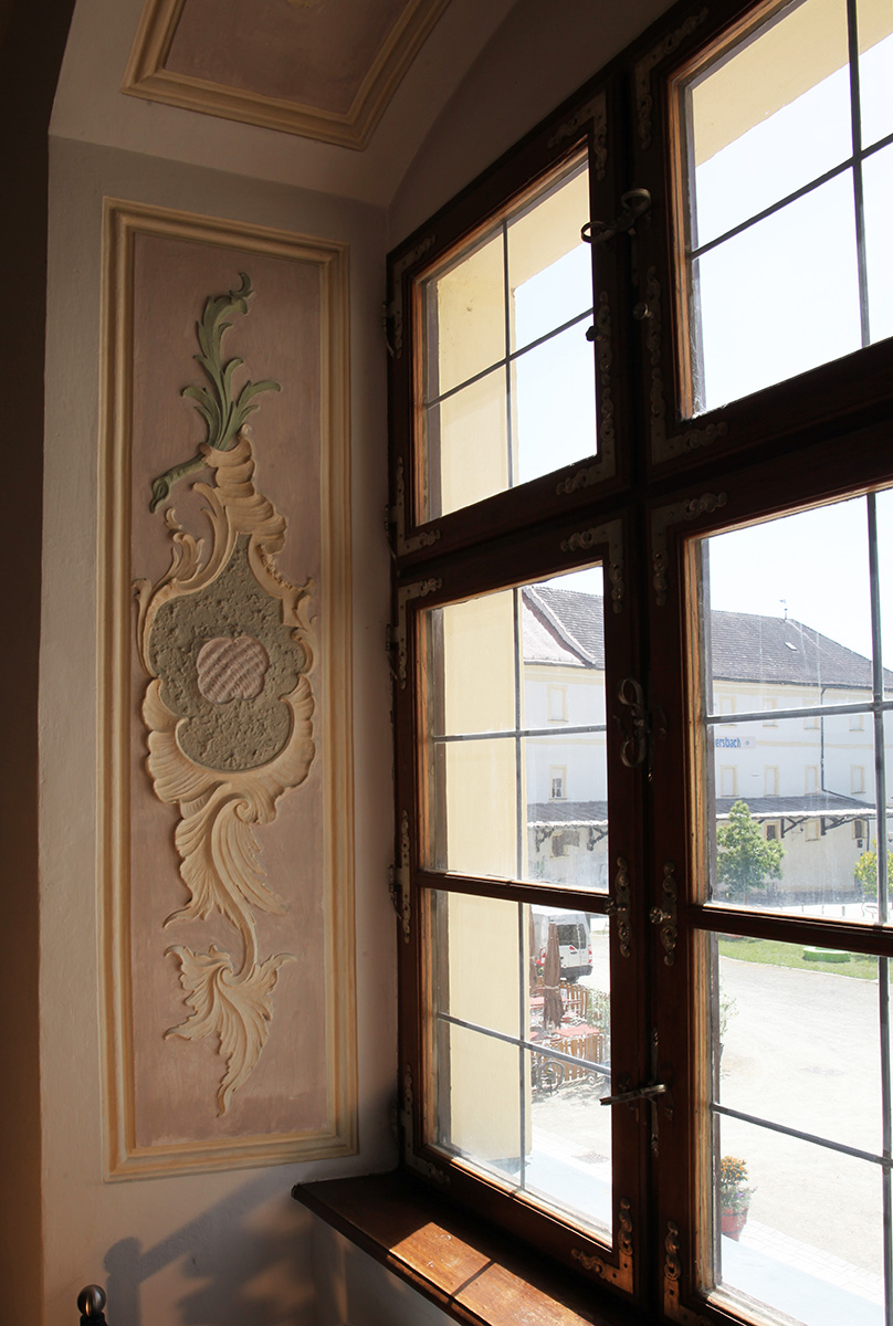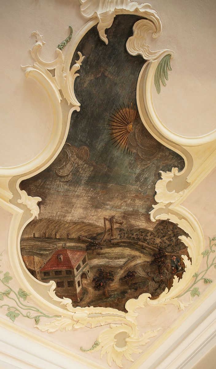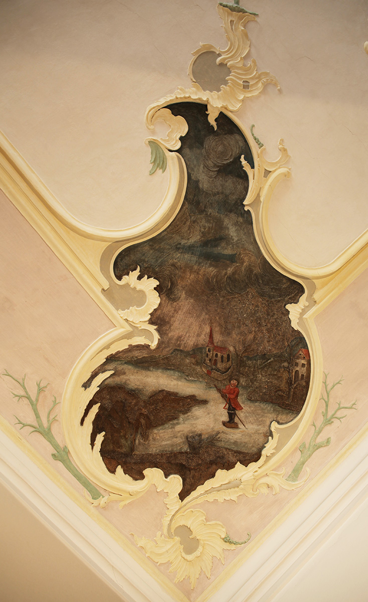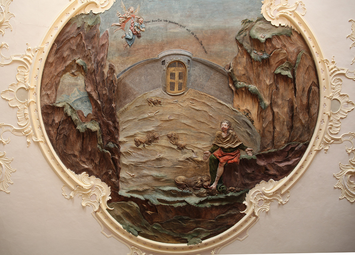 Zweites Speisezimmer (für Gäste): Der Raum hat zwei Fensterachsen und eine Flachdecke. Die Ausstattung ist gleichzeitig mit dem vorbeschriebenen Zimmer und vom gleichen Meister. In der Mitte der Decke großes Stuckrelief in Rocailleumrahmung: Daniel in der Löwengrube wird durch den Propheten Habakuk gespeist. Den Deckenspiegel umrahmt eine Muschelwerkkomposition mit Eckkartuschen, in denselben ein Salamander, Reiherbeize, Wildbret und Schnecken. Über den Türn befinden sich auch hier stuckierte figürliche Supraporten. 1. Samson, der im Rachen eines erlegten Löwen einen Bienenschwarm mit Honig fand (Vom Fresser ging Speise aus, von starker Süßigkeit.) – 2. Ignatius von Antiochien, den Löwen vorgeworfen. (Ich bin ein Weizenkorn Christi und muss durch der Bestie Zähne zermalmt werden, um als reines Brod befunden zu werden.) Die Bedeutung der Reliefs ist durch Spruchbänder mit den vorstehenden Texten erläutert. Die Stuckaturen stehen auch hier in Gelb auf Rosafond, die Reliefs sind farbig behandelt. Die derbe Bemalung durch Andreas Math betont die Mängel der Reliefs und verwischt ihre Feinheiten.