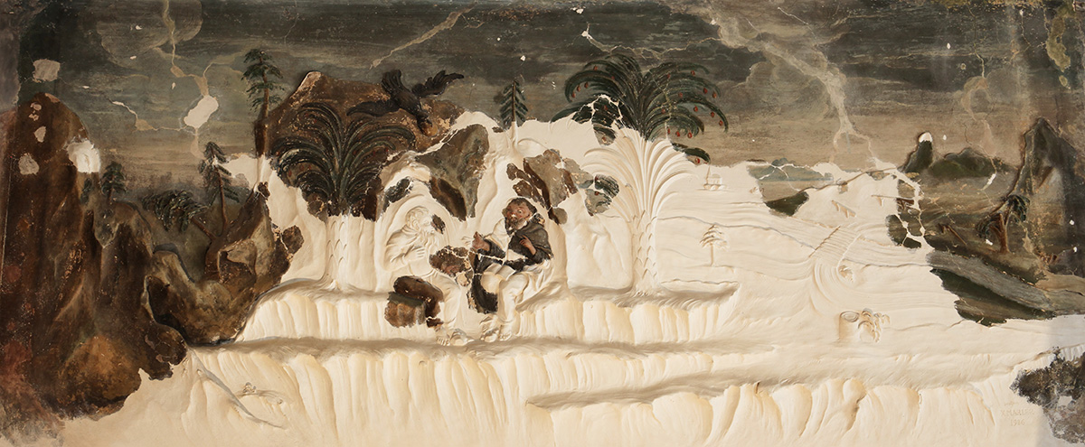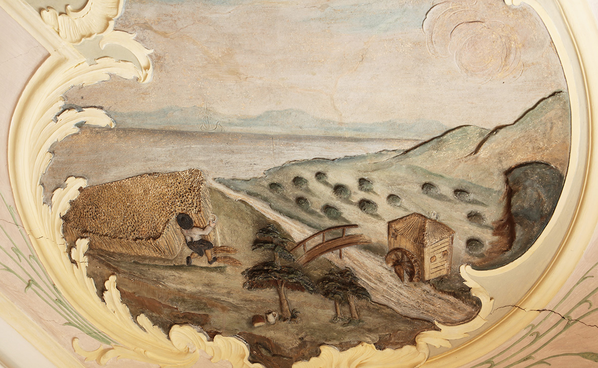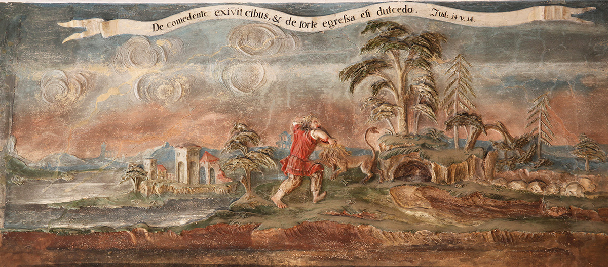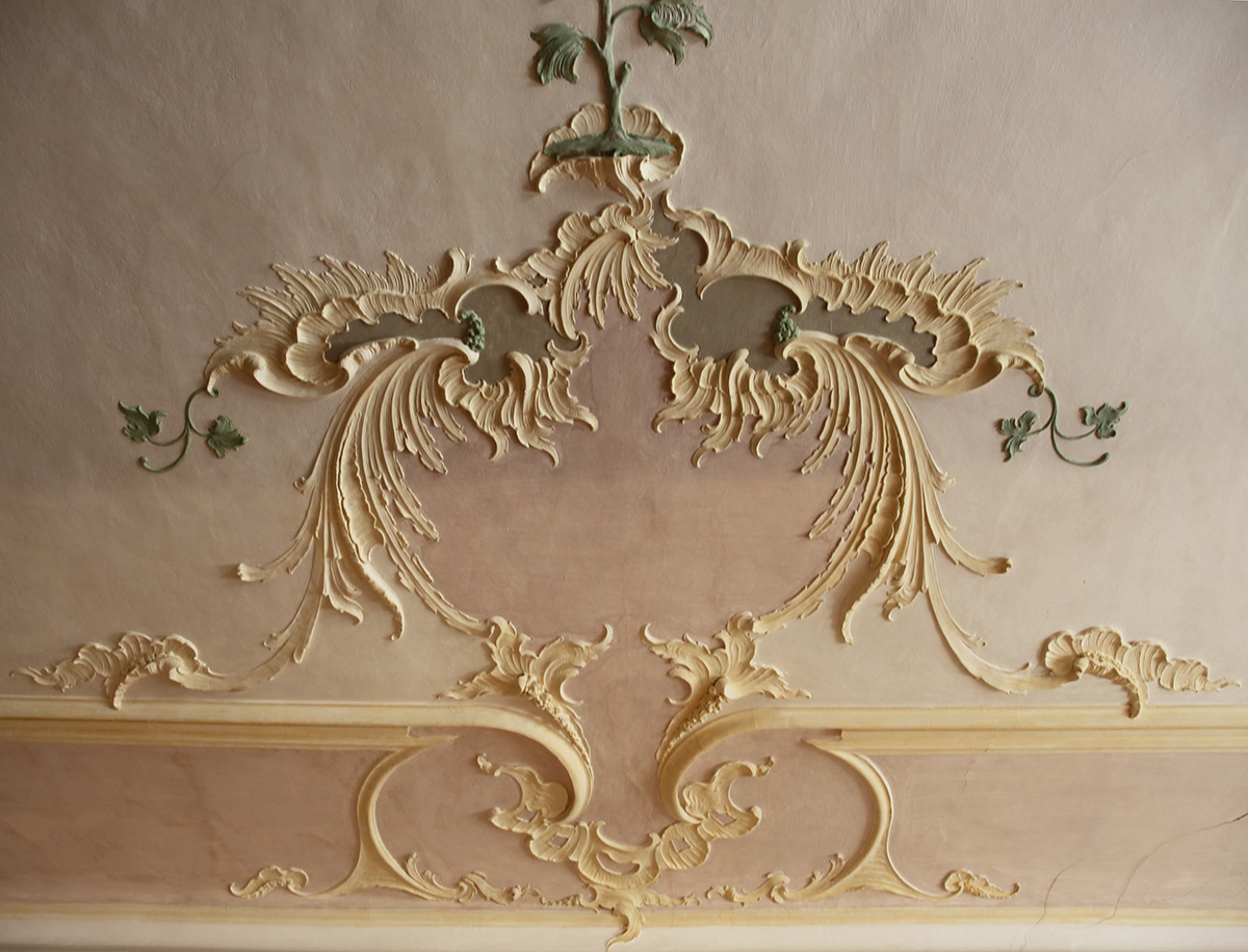 Zweites Speisezimmer (für Gäste): Der Raum hat zwei Fensterachsen und eine Flachdecke. Die Ausstattung ist gleichzeitig mit dem vorbeschriebenen Zimmer und vom gleichen Meister. In der Mitte der Decke großes Stuckrelief in Rocailleumrahmung: Daniel in der Löwengrube wird durch den Propheten Habakuk gespeist. Den Deckenspiegel umrahmt eine Muschelwerkkomposition mit Eckkartuschen, in denselben ein Salamander, Reiherbeize, Wildbret und Schnecken. Über den Türn befinden sich auch hier stuckierte figürliche Supraporten. 1. Samson, der im Rachen eines erlegten Löwen einen Bienenschwarm mit Honig fand (Vom Fresser ging Speise aus, von starker Süßigkeit.) – 2. Ignatius von Antiochien, den Löwen vorgeworfen. (Ich bin ein Weizenkorn Christi und muss durch der Bestie Zähne zermalmt werden, um als reines Brod befunden zu werden.) Die Bedeutung der Reliefs ist durch Spruchbänder mit den vorstehenden Texten erläutert. Die Stuckaturen stehen auch hier in Gelb auf Rosafond, die Reliefs sind farbig behandelt. Die derbe Bemalung durch Andreas Math betont die Mängel der Reliefs und verwischt ihre Feinheiten.