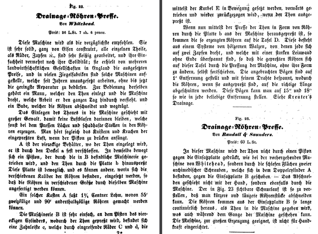 In einem Gemache des Erdgeschoßes war eine Drainageröhrenpresse aufgestellt worden, welche der Herr Baron arbeiten ließ. In kurzer Zeit waren einige Röhren fertig, nur noch des Brennens bedürftig. Mit einigem Widerstreben folgte man der Einladung, eine Treppe höher zu steigen. Kleidung und Stiefel waren schon nicht mehr in anständiger Verfassung. Im Speisesaale waren Bier, Brod und kalte Küche zur Erquickung der Gäste bereitet, zu deren Genuß der Herr Baron dieselben herzlichst auf forderte. Diesen ward hier auch die Freude, die Frau Baronesse Gemahlin zu sehen, welche wegen des Ablebens ihres Herrn Vaters des k. Generallieutenants Freiherrn von Gumpenberg noch in Trauerkleidung erschien. Dieselbe unterhielt sich freundlich mit den Anwesenden. Mit ihr waren auch einige liebenswürdige Kinder gekommen, welche sich zutraulich unter die Gäste mischten. Ein Theil der Letztern benützte die kurze Zeit, um auch die ein Stockwerk höher in 2 Sälen aufgestellte bändereiche Bibliothek, alle Zweige des menschlichen Wissens umfassend, zu sehen. Man mußte sich in eine öffentliche Bibliothek versetzt glauben, und doch war es nur ein Theil der Bücher, ein anderer Theil, besonders theologische Werke enthaltend, ist in Allersbach aufgestellt.