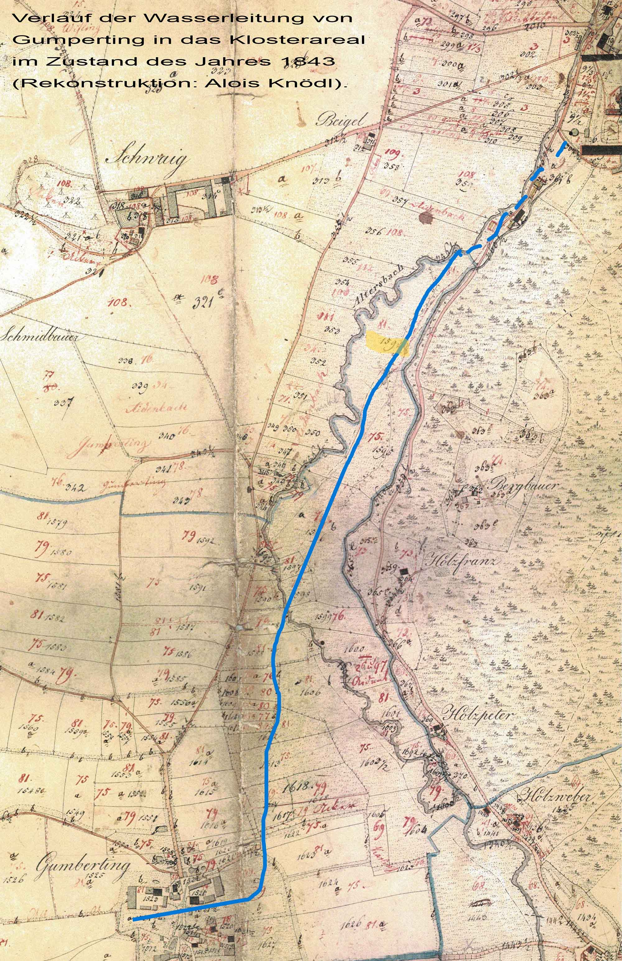 Der Verlauf der Wasserleitung von Gumperting nach Aldersbach war bis dato ziemlich unbekannt. Man wusste nur, dass es sie gegeben hat. Bei Nachforschungen im Urkataster (StA Landshut 11753 ff) wegen anderer Kriterien, wurde quasi nebenbei unter der Rubrik „Besonderheiten“, heute würde man dies Grundbucheintrag nennen, festgestellt, dass die Röhre (1843) noch in Betrieb war und weiterhin genutzt wurde. Bei den genannten „Besonderheiten“ waren die Flurnummern aufgeführt durch die die Röhren verlegt waren. Beim Amt für Digitalisierung, Breitband und Vermessung in Vilshofen, existiert der „Ur Plan“ aus ca. 1830, in dem die alten Flurnummern aus Klosterzeit eingetragen und ebenso die neu vergebenen Flurnummern vermerkt sind. Diese Grundstücke mussten nach der Säkularisation von den Bauern des Klosters erst erworben werden, um sie als Eigentümer zu bearbeiten. Bis zur Säkularisation waren Flurnummern und Hausnummern identisch. Erst Montgelas, in diesem Fall sei ihm ausdrücklich gedankt, zeichnet für das moderne Bayern als verantwortlicher, eben für die Modernisierung aller staatlichen Organe. Diese Flurnummern galten bis zur Flurbereinigung, in Gemeinden in denen keine Flurbereinigung stattfand, gelten sie noch heute. Durch die Vergabe der neuen Flurnummern war es möglich den Verlauf der Röhren wie sie 1843 verlaufen sind nach zu vollziehen. Ob sie Zeit ihres Bestehens (seit etwa 1300) stets den gleichen Verlauf nahmen wissen wir nicht, große Veränderungen waren auf Grund physikalischer Grundsätze ohnehin nicht möglich. Wenn man heutige Maßstäbe anlegt ist es so, wenn sich Reparaturen allzu sehr häufen ist eine Erneuerung sinnvoll, es geht ja auch um die Versorgungssicherheit. Die oben erwähnte Grunddienstbarkeit wurde entschädigt durch die Gewährung einer Kiesentnahme der betroffenen Grundbesitzer aus den Aretinschen Wäldern zum Wegeunterhalt, diese Gewährung wurde nach Beendigung der Wasserförderung bestimmt gelöscht. Dafür hatte das Haus Aretin jederzeit Zugang bei etwaiger Reparatur, (Rohrbruch) . Die Aretinsche Brauerei als Rechtsnachfolger des Klosters war ja Hauptnutznießer der Wasserleitung.