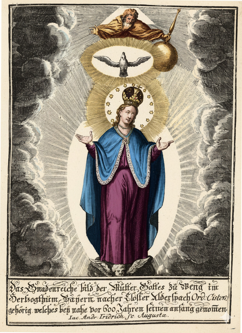In der späteren Filialkirche Weng wurde die Kirchenpatronin Maria besonders verehrt. Ab wann sich hier eine Wallfahrt entwickelte, ist allerdings unbekannt. Überliefert ist ein Kupferstich der Wenger Wallfahrt, der um 1746 angefertigt wurde und Maria mit einem besonders verzierten Umhang zeigt.(3) Nach Abt Gerard Hörger soll diese Kleidungsreliquie bereits von Bischof Otto an die Kirche von Weng geschenkt worden sein. Kontakte der Bamberger Bischöfe nach Weng lassen sich tatsächlich nachweisen: Wie eingangs erwähnt, beauftragte im Jahr 1142 Propst Askuin mit der Seelsorge in dieser Kirche, Ottos Nachfolger Egilbert bestätigte das Rechtsgeschäft. Eine Nonne aus Seligenthal hatte das Hemd (vermutlich im Auftrag Abt Michael Kirchbergers) unter anderem mit kostbaren Perlen geschmückt, bevor es in einer feierlichen Prozession von der Portenkapelle in die Klosterkirche überführt und dort in einem neu erbauten Altar zur Verehrung ausgestellt wurde.(4)
